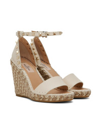 Grained calfskin heeled sandals in off-white. · Signature pyramid studs throughout · Open toe · Strap at vamp · Pin-buckle ankle strap · Logo patch at padded footbed · Blanket stitching at welt · Braided raffia wedge heel and midsole · Rubber sole · Heel: H4" Supplier color: Light ivory/Natural