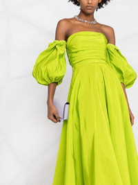 off-shoulder floor-lentgh dress Valentino Garavani's DNA has always been about timeless and impeccable style. A fine example is this sleek off-shoulder dress, in a full-lime colour and a floor-length design. Highlights - Valentino ready to wear - Bright lime - Silk-blend - Off-shoulder - Rear zip fastening - Short sleeves - Floor-length Made in Italy Composition Outer: Silk 100% Lining: Viscose 59%, Silk 41% SIZE & FIT Model measurements Height 5 ft 11 in(1.8 m) Bust/Chest 31.49 in(80 cm) Hips 35.82 in(91 cm) Waist 24.8 in(63 cm) FittingInformation This piece fits true to size. We recommend you get your regular size Designed for a close fit at the bust and waist, but loose at the hip Made with a mid-weight non-stretch fabric Washing instructions Read Manufacturer Guidelines