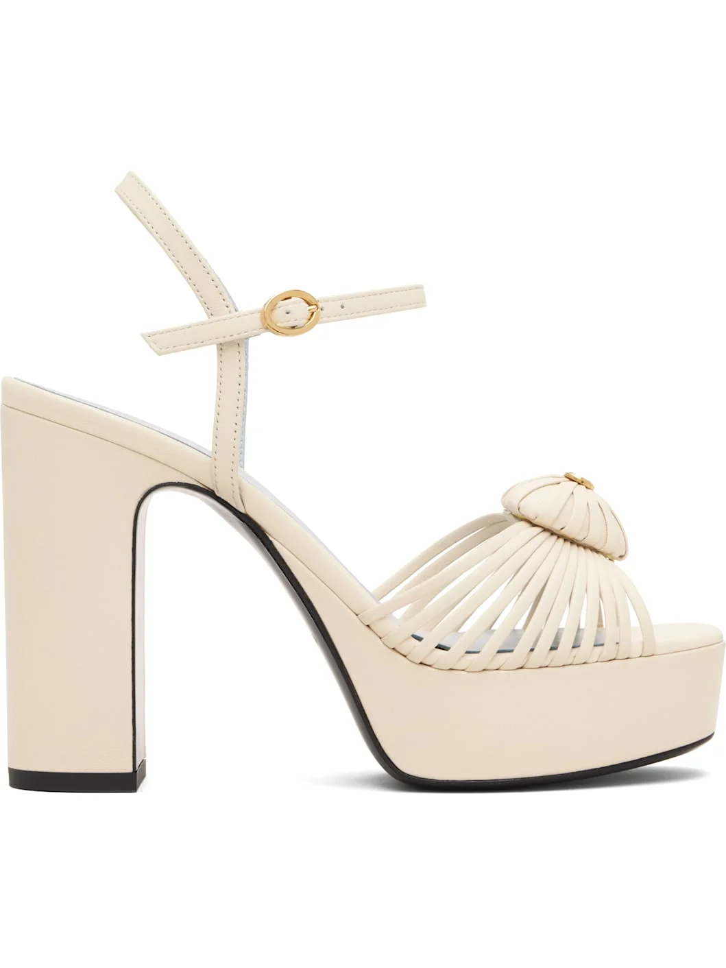 Buffed nappa leather heeled sandals. · Open square toe · Straps and leather heart with logo hardware at vamp · Pin-buckle slingback strap · Block heel with rubber injection · Covered platform midsole · Leather sole · Platform: H1.25" · Heel: H4.25" Supplier color: Butter white Leather. Made in Italy 252807F125012