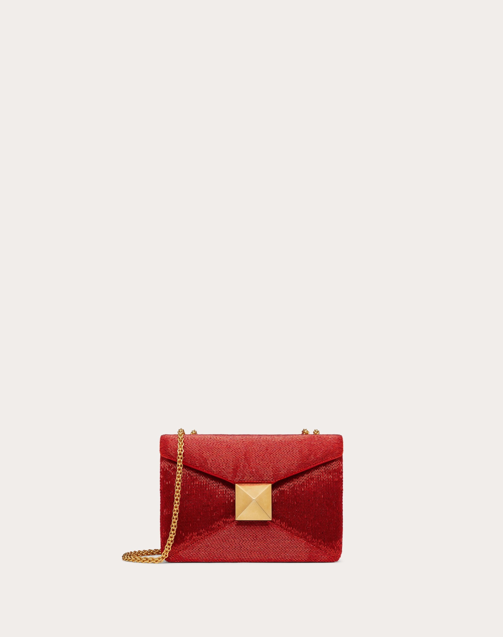Valentino Garavani ONE STUD bag with chain entirely embroidered with tubular Pearls. Clutch design decorated with maxi stud at the front. The bag can be worn as a crossbody/shoulder bag thanks to the adjustable chain. - Antique Brass finish on stud and metal parts - Magnetic closure - Nappa Lining. Interior: one flat pocket - Drop Length: 55 cm / 21.7 in. - Dimensions: W19xH14xD11 cm / W7.5xH5.5xD4.3 in. - Weight: 0.63 Kg / 1.4 lbs - Made in Italy Product Code WB0K21BVU_KE7