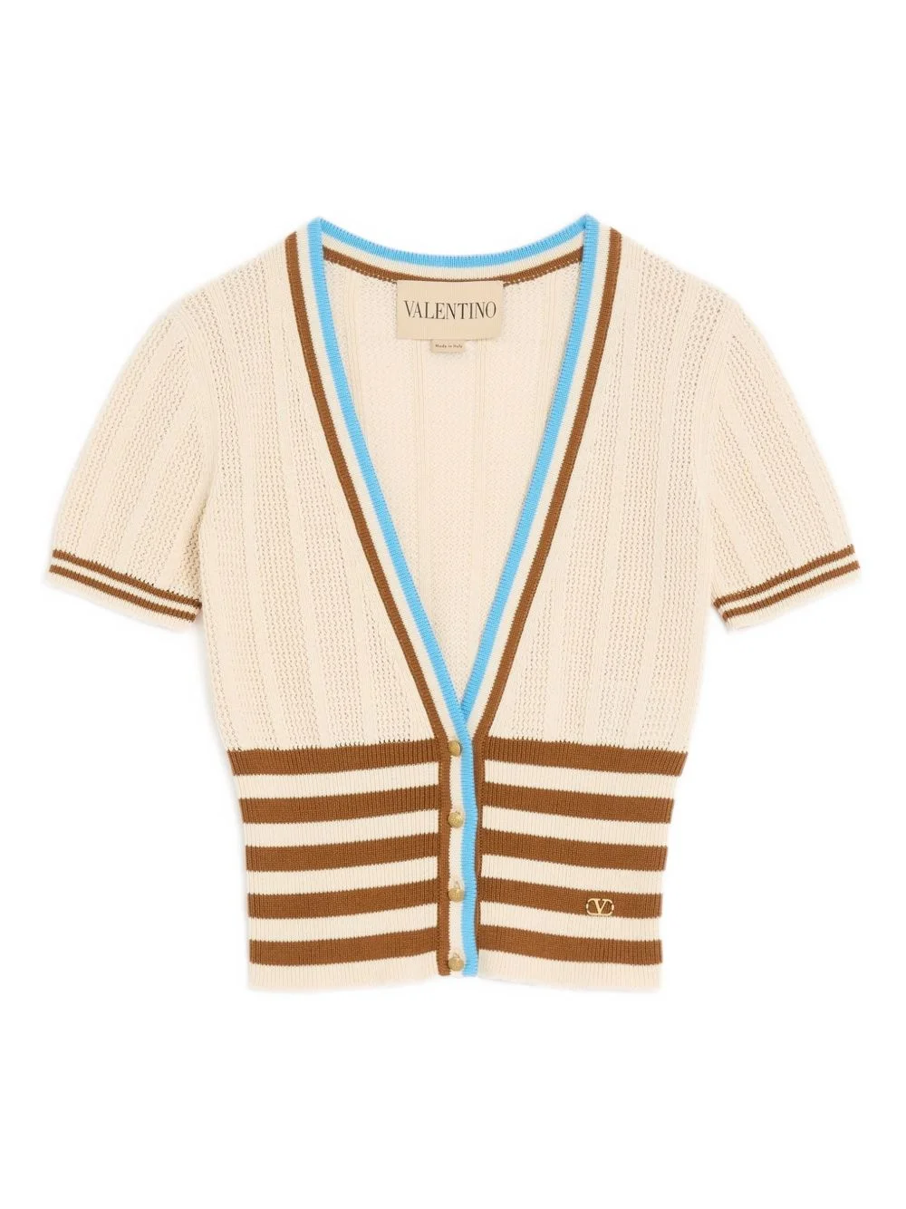 striped logo-plaque cardigan Highlights - Valentino cardigan - Beige - V-neck - Striped - Front button fastening - Short sleeves - Logo-detail - The full look includes valentino garavani accessories. Made in Italy Composition Cotton 100% Washing instructions Read Manufacturer Guidelines