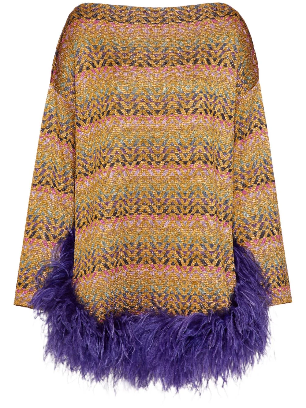 Optical feather-trim jumper Highlights - Valentino ready to wear - Multicolour - Patterned jacquard - Lurex detailing - Feather-trim detailing - Boat neck - Drop shoulder - Long sleeves - The full look includes valentino garavani accessories. Made in Italy Composition Ostrich Feather 100%, Turkey Feather 100%, Viscose 81%, Metallic Fibre 19% Washing instructions Read Manufacturer Guidelines