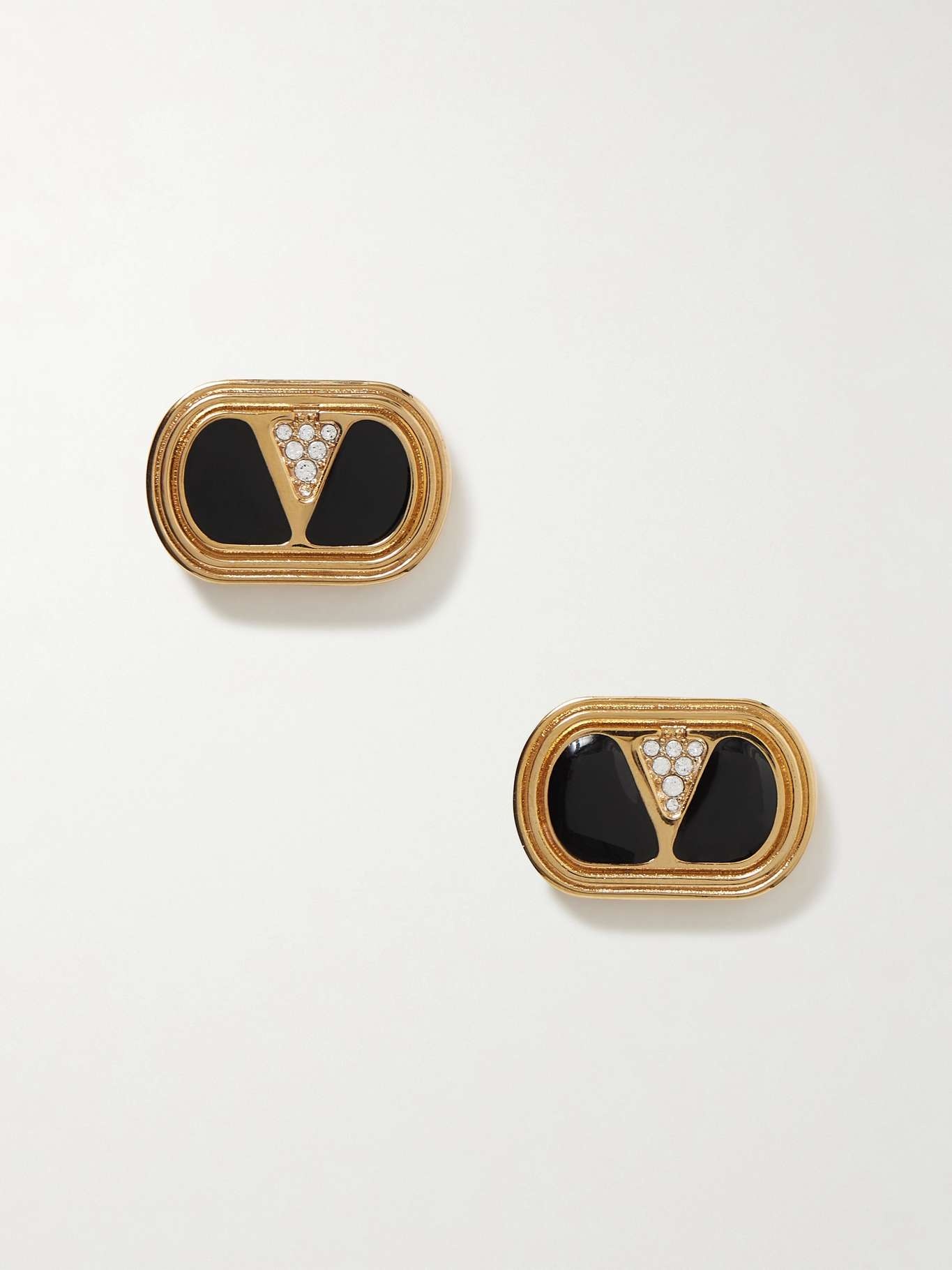 EDITORS'NOTES Valentino Garavani's earrings feature the brand's signature 'VLogo' motif framed by glossy black enamel and sparkling crystals. They're made from gold-tone metal that ribbed along the edges of the oblong shape. SIZE & FIT This item’s measurements are: - Height: 1.5cm / 0.6in - Width: 2.5cm / 1in DETAILS & CARE - Bell-back fastening for pierced ears