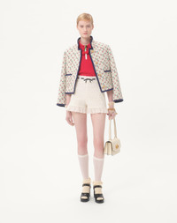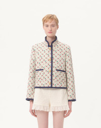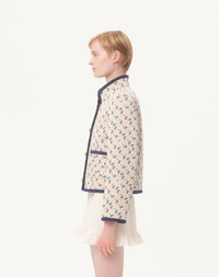 Padded peacoat in Cherryfic print Jacquard with contrasting edges - Front closure with soutache buttons - Jacquard (85% Cotton, 15% Polyester) - VLogo Lining with Flowers and Stripes (74% Acetate, 26% Silk) - Length: 50.5 cm / 19.9 in. from the shoulders in an Italian size 40 - The model is 176 cm / 5'9" tall and wears an Italian size 40 - Made in Italy The look of the model is completed by a Valentino Garavani Vain Bag and Valentino Garavani Fawcette Shoes. Product code: 7B3CJ3Q79LG_BDR