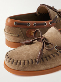A refined take on classic boat shoes, Valentino Garavani's pair is crafted from plush suede and trimmed with leather. They're detailed with the classic hide laces, complete with barrel knots, and set on rubber outsoles. The sides are branded with 'VLogo' plaques. Size & Fit - Fits true to size, take your normal size - Italian sizing Details & Care - Slight heel - Light-brown suede, tan and brown leather (Cow) - Lace-up front