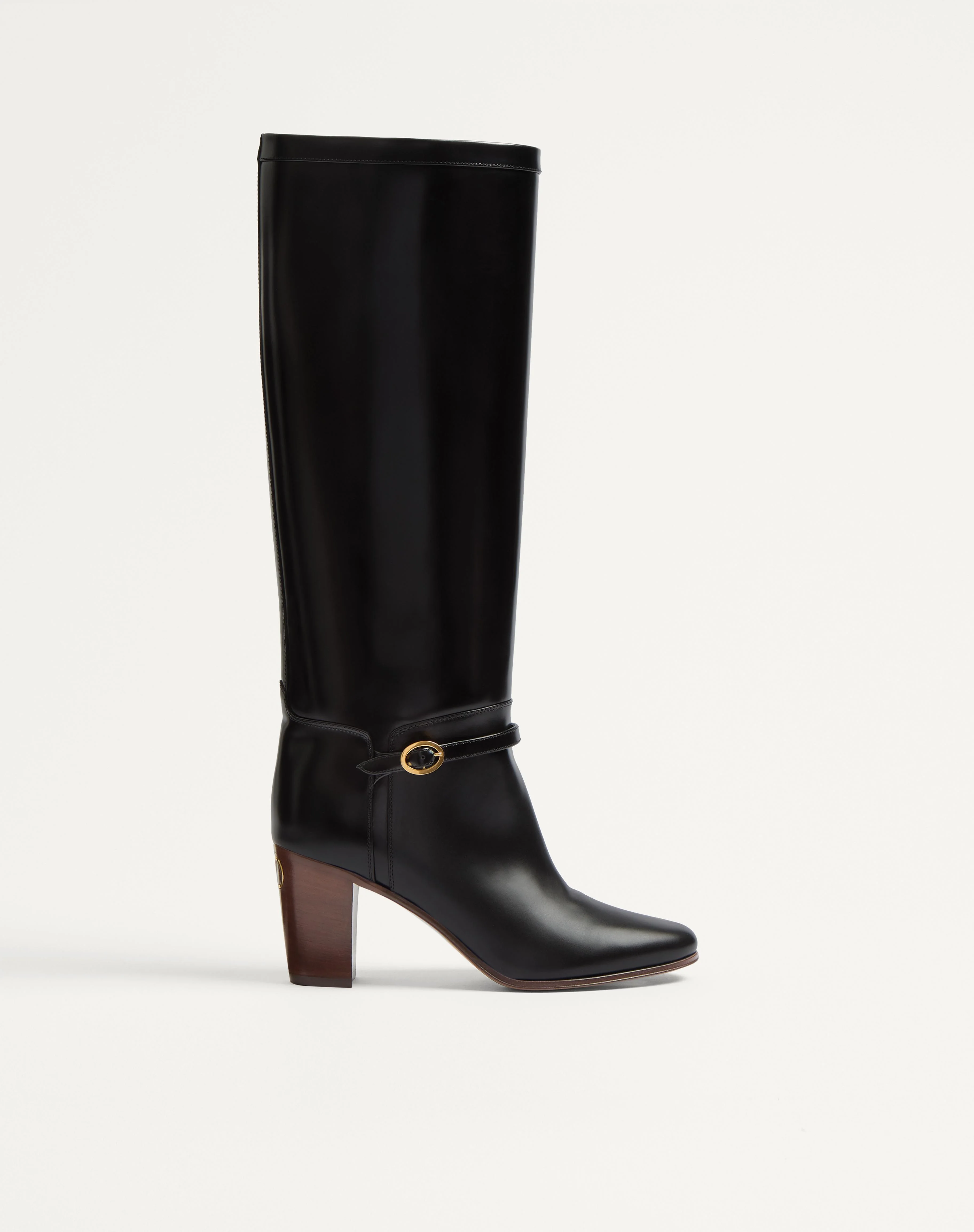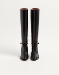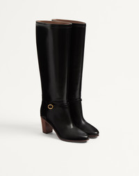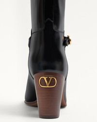 Valentino Garavani Pattie boot in calfskin leather - VLogo Signature accessory with antique-effect brass finish - Calfskin strap with buckle - Leather block heel - Heel height: 75 mm / 3 in. - Boot shaft height: 39 cm / 15.4 in.; Italian size 37 - Made in Italy Product code: 6W2S0LD6ZJM_0NO