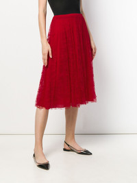 pleated chantilly lace skirt Red silk and cotton blend pleated chantilly lace skirt from Valentino featuring a high waist, a concealed side zip fastening, a pleated design, a floral lace pattern and a mid-length. Made in Italy Composition Lining: Silk 91%, Spandex/Elastane 9% Outer: Polyamide 68%, Cotton 32% SIZE & FIT Model measurements Height 5 ft 10 in(1.79 m) Bust/Chest 32.28 in(82 cm) Hips 35.03 in(89 cm) Waist 23.62 in(60 cm) FittingInformation This piece fits true to size. We recommend you get your regular size Cut for a loose fit Made with a lightweight fabric Washing instructions Dry Clean Only