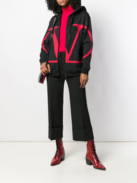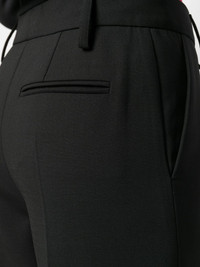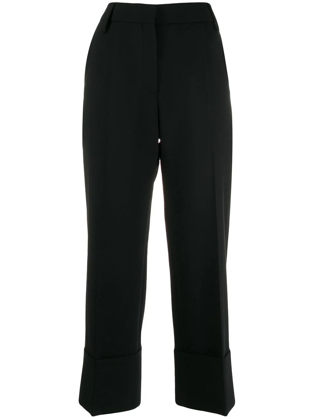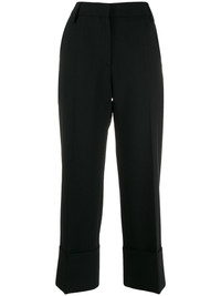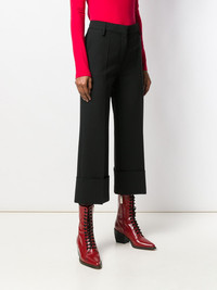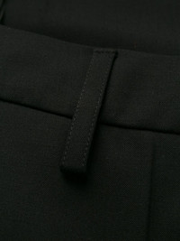 pleated cropped trousers Capture the essence of Italian luxury and glamour with the latest Valentino collection, as seen in these black virgin wool blend pleated cropped trousers. Featuring a high waist, belt loops, a concealed front fastening, two front pockets, rear welt pockets and turn up hems. Made in Italy Composition Lining: Viscose 63%, Silk 37% Outer: Virgin Wool 94%, Spandex/Elastane 4%, Polyamide 2% SIZE & FIT Model measurements Height 5 ft 11 in(1.8 m) Bust/Chest 31.49 in(80 cm) Hips 35.82 in(91 cm) Waist 24.8 in(63 cm) FittingInformation This piece fits true to size. We recommend you get your regular size Cut for a loose fit Made with a mid-weight stretch fabric