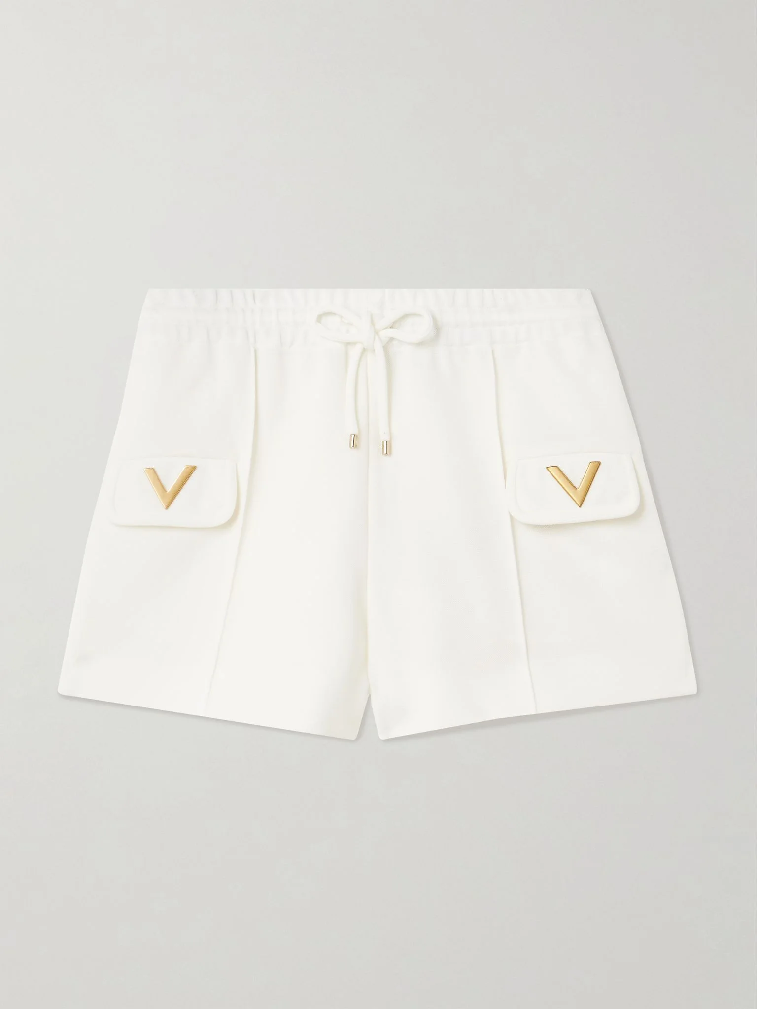 Valentino Garavani's shorts have statement 'V'-shaped hardware that makes the casual staple feel elevated. They've been made in Italy from soft stretch-jersey with wide legs and a comfortable elasticated waist. Large to size. See Size & Fit notes. Size & Fit - Fits large to size, take one size smaller than normal - High-rise, designed for a slightly loose fit - Mid-weight, stretchy fabric - Model is 177cm/ 5'10", normally wears an IT 40 and is wearing an IT 38 Model measurements: - Bust: 77cm/ 30.5" - Waist: 62cm/ 24.5" - Hip: 88cm/ 34.5" Details & Care - White stretch-jersey - Pull on - 90% polyester, 10% elastane; pocket lining: 100% cupro - Dry clean