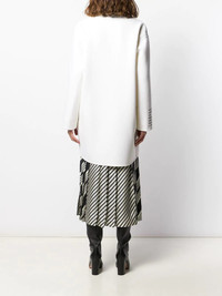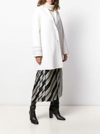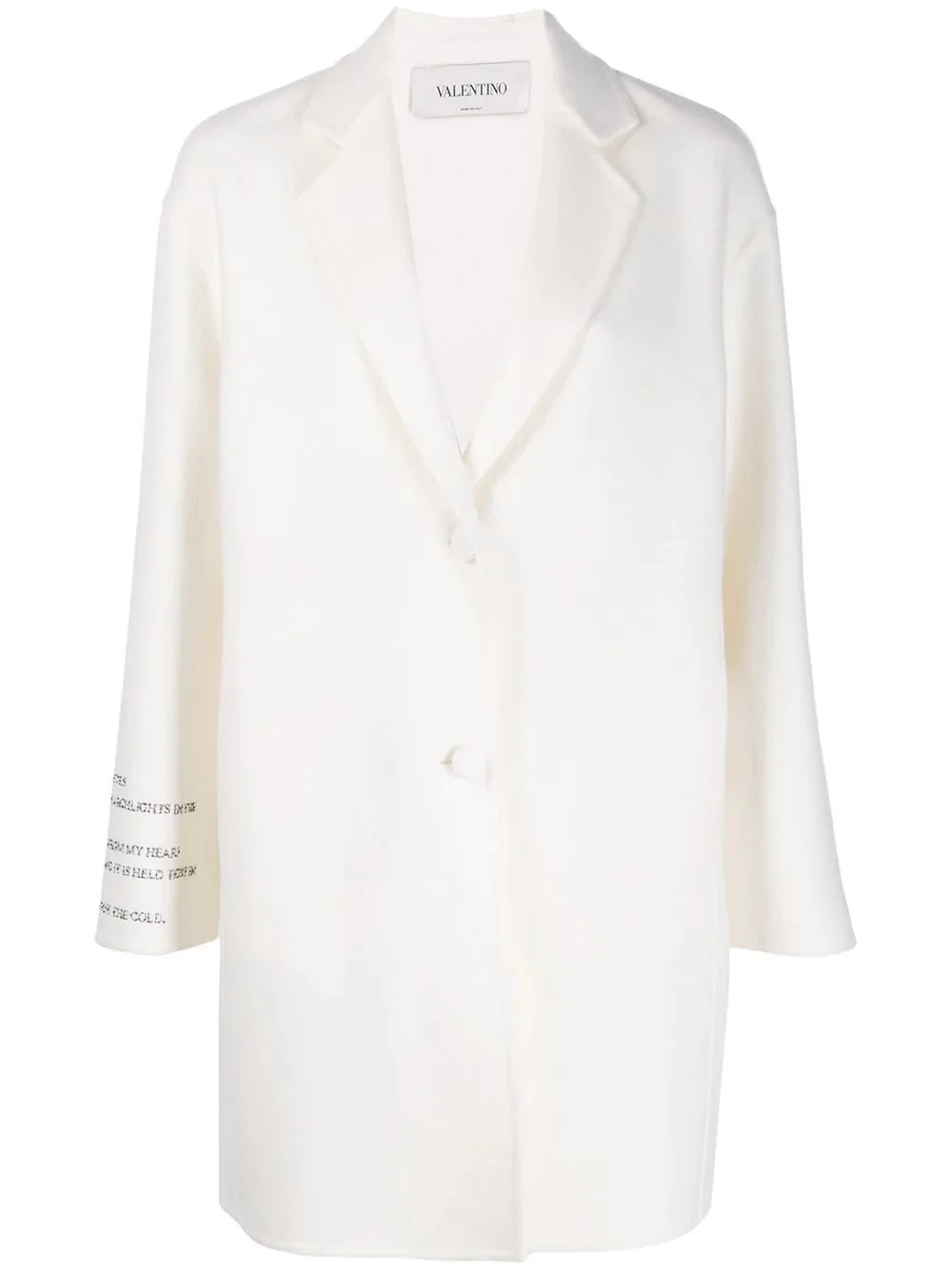 poem detail single breasted coat Smart can also mean stylish, didn't you know? Crafted in Italy from white wool and cashmere, this Valentino coat is printed with a poem at the cuff. Show off. Featuring a collar style, a v-neck, a front button fastening, a relaxed fit, long sleeves, an embroidered design and beaded embroidery. Made in Italy Composition Lining: Viscose 63%, Silk 37% Outer: Polyester 100%, Virgin Wool 95%, Metallic Fibre 39%, Polyamide 33%, Cotton 28%, Cashmere 5% SIZE & FIT Model measurements Height 5 ft 9 in(1.75 m) Bust/Chest 32.67 in(83 cm) Hips 36.22 in(92 cm) Waist 24.8 in(63 cm) FittingInformation This piece fits true to size. We recommend you get your regular size Cut for a loose fit Made with a mid-weight non-stretch fabric Washing instructions Dry Clean Only