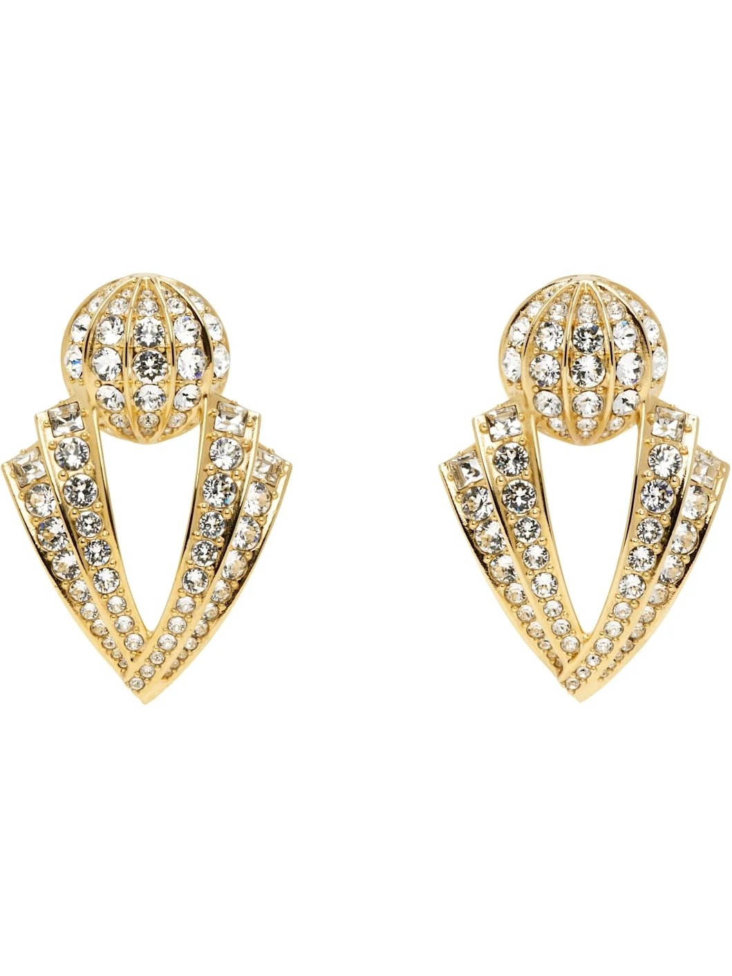 Pair of drop earrings in gold tone. · Pave-set crystals throughout · Clip-on fastening · H2.25" x W1.5" Supplier color: Oro/Crystal Metal, crystal. Made in Italy 251807F022021