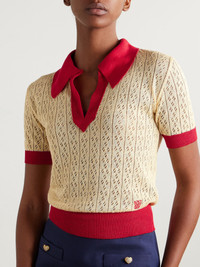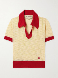 Valentino Garavani's polo shirt is made from a linen-blend that's pointelle-knitted in a pretty pattern, enhancing the breathable feel. It has red trims and is embroidered with a logo above the hem. Slip yours on with tailored pants or a mini skirt. Size & Fit - Fits true to size, take your normal size - Designed for a slim fit - Lightweight, open knit - Model is 177cm/ 5'10" and is wearing a size XSmall Model measurements: - Bust: 81cm/ 32" - Waist: 62cm/ 24.5" - Hip: 89cm/ 35" Details & Care - Ecru and red linen-blend - Slips on - 54% linen, 46% viscose
