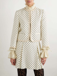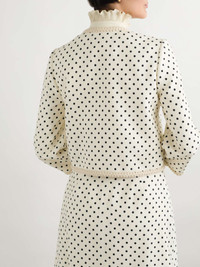 EDITORS'NOTES Valentino Garavani's jacket is decorated with classic polka dots, which enhance the retro appeal. Woven in a sophisticated design, it has a slightly loose fit with braided trims tracing the collarless neckline and cropped hem. SIZE & FIT Model measurements: - Fits true to size, take your normal size - Designed for a slightly loose fit - Cropped length - Cropped sleeves - Mid-weight, non-stretchy fabric - Model is 175cm/ 5'9" and is wearing an IT 40 - Bust: 85cm/ 33.5" - Waist: 62cm/ 24.5" - Hip: 91cm/ 36" DETAILS & CARE - Cream and black viscose - Concealed hook fastenings through front - 100% viscose