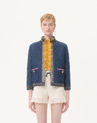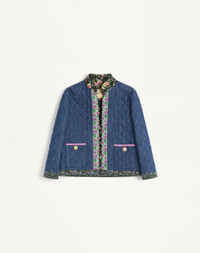 Padded Chambray Denim jacket with floral fabric edges - Rhinestone button details on the pockets - Chambray Denim (100% Cotton) - Unlined - Length: 53 cm / 20.9 in. from the shoulders in an Italian size 40 - The model is 176 cm / 5'9" tall and wears an Italian size 40 - Made in Italy The look of the model is completed by a Valentino Garavani Bag and Valentino Garavani Adamantine Shoes. Product code: 7B3DC3Y09AG_CK8