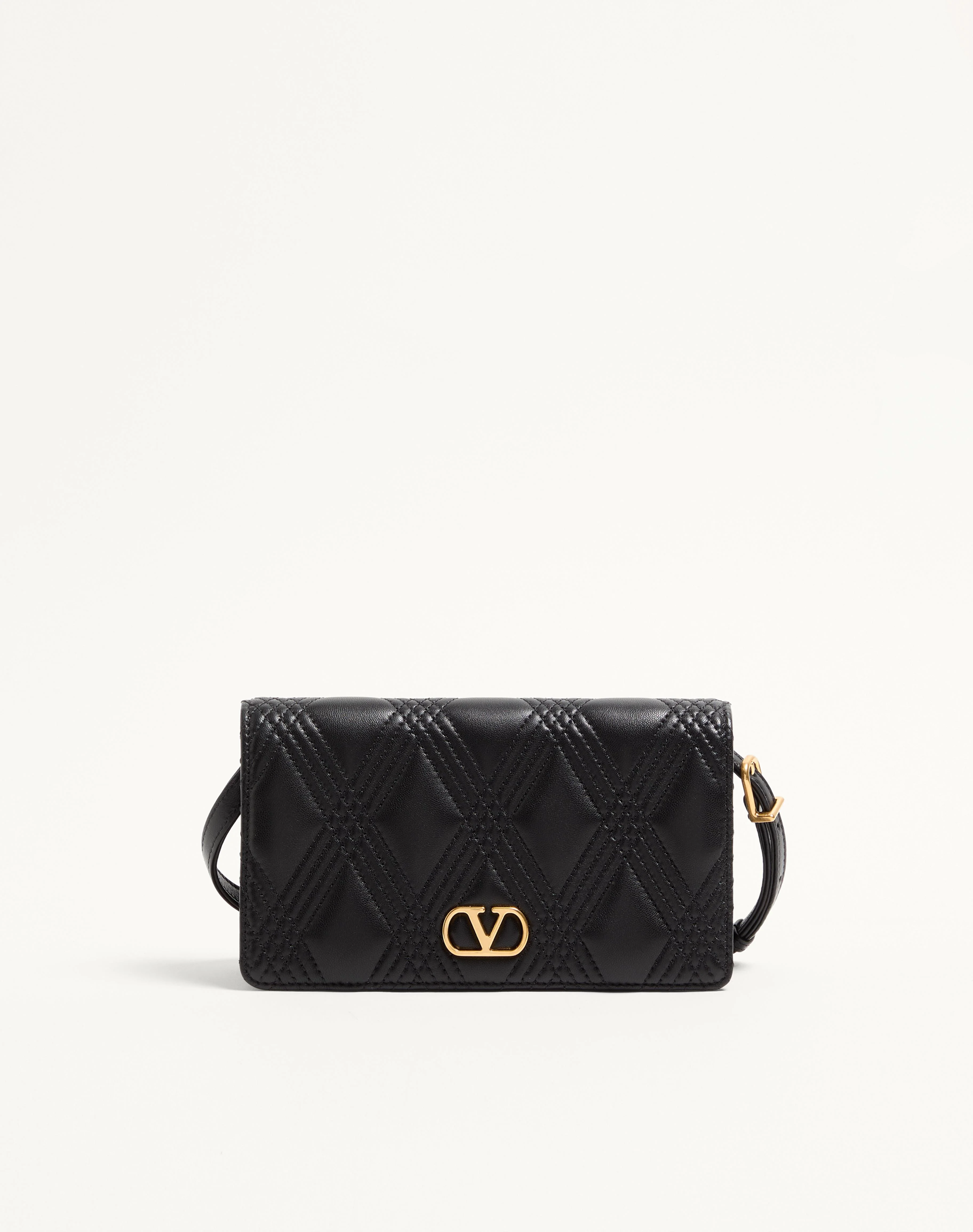 Valentino Garavani Quiltie 67 mini shoulder bag in nappa leather. Quilted construction with diamond pattern outlined with tone-on-tone stitching. The bag can be comfortably worn on the shoulder thanks to the adjustable leather handle. - Magnetic button closure - Antique brass finish logo and hardware - Nappa leather lining. Interior: one zippered pocket and three card slots - Removable and adjustable leather shoulder strap. Drop length: 21.5 cm / 8.5 in. - Dimensions: W20xH12xD5 cm / W7.9xH4.7xD2.0 in. - Made in Italy This product contains magnets. Please consider if this product will be worn within 15 cm from any implanted device. Any concerns please contact your healthcare professional. Product code: 7W2P0AV2MIC_0NO