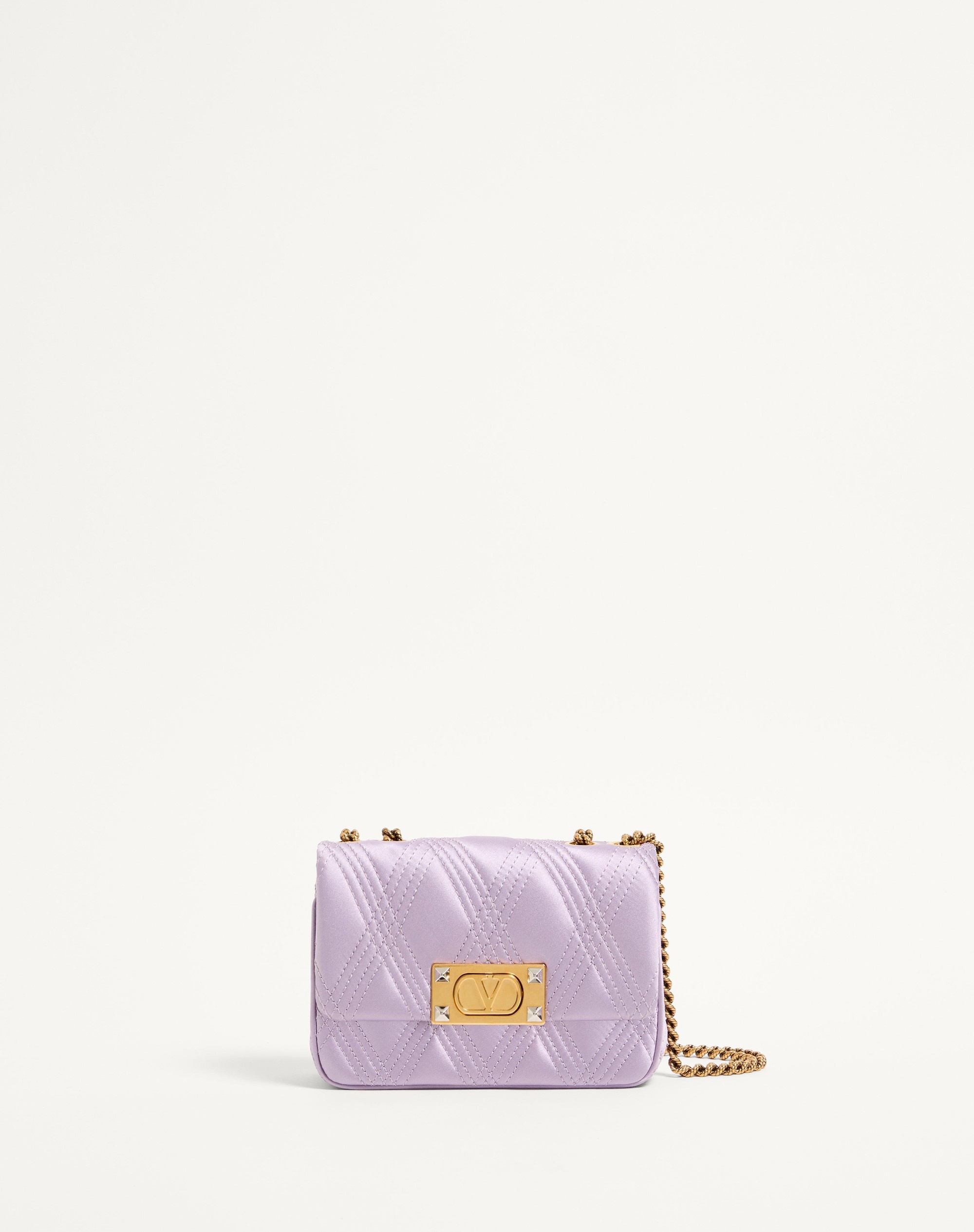 Valentino Garavani Quiltie 67 small satin shoulder bag with chain. Quilted construction with diamond pattern outlined with tone-on-tone stitching. The bag can be worn on the shoulder/crossbody thanks to the sliding chain. - Hardware in antique gold finish - The closure features a VLogo Signature plaque in antique brass finish and palladium-finish studs - Nappa lining. Interior: slip pocket - Chain drop length: min. 25.5 cm to max. 50 cm / min. 10 in. to max. 19.6 in. - Dimensions: W19xH13xD6 cm / W7.4xH5.1xD2.3 in. - Made in Italy Product code: 6W0B0R08DZR_R2G