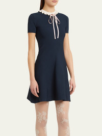 Valentino Garavani stretch viscose knit mini dress features a ruffle trim with grosgrain selftie ribbon Crew neckline Short sleeves Hem falls above the knee Aline silhouette Invisible back zipper Viscose/polyester Made in Italy