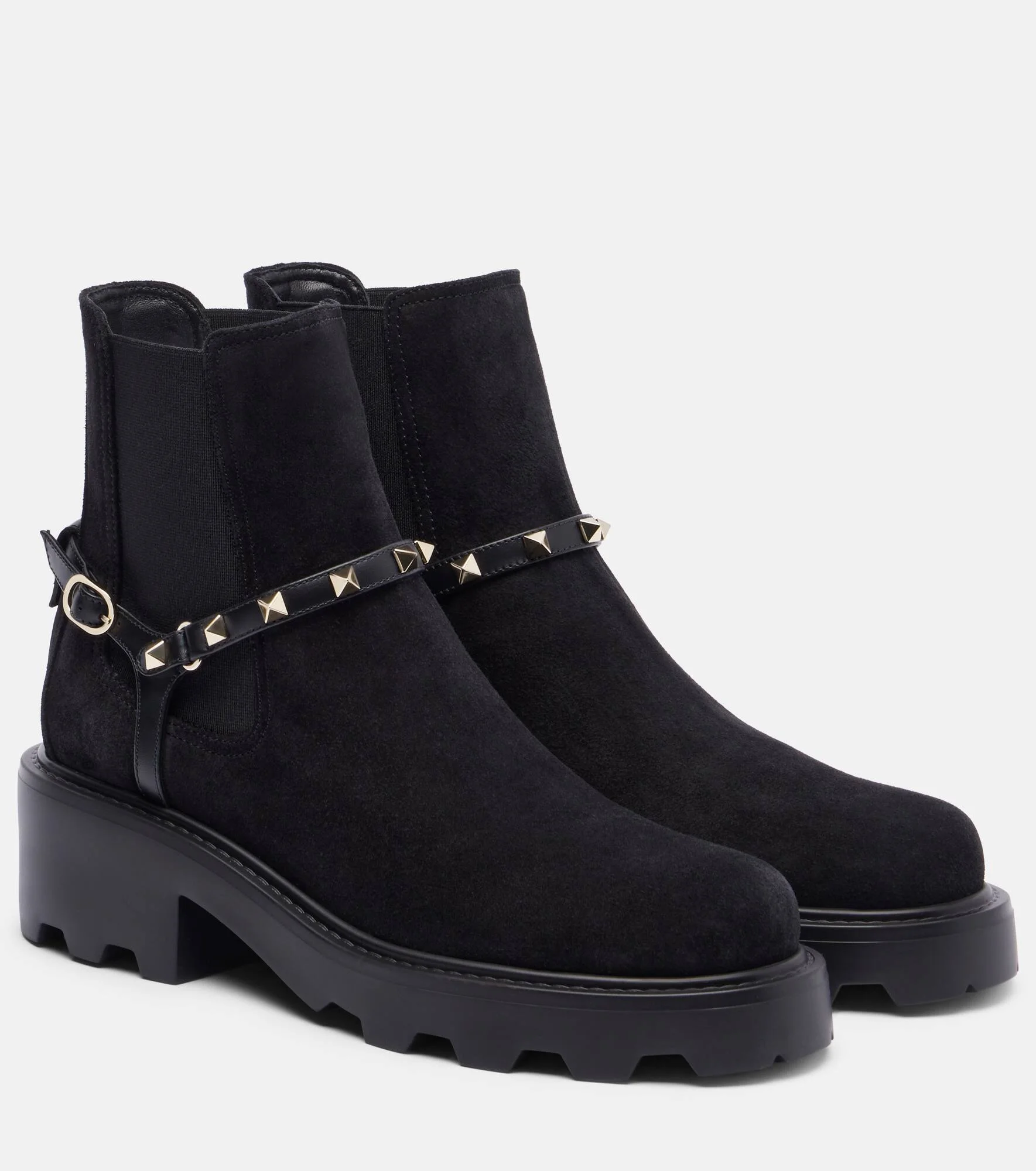 Valentino Garavani looked to ancient architecture to create the now-iconic Rockstud embellishments. Featuring the signature detailing, these ankle boots are expertly crafted from soft suede and feature 55mm block heels with 25mm platforms. Product Details - Upper: leather (suede), fabric - Lining: leather - Sole: leather insole and sole - Toe shape: round toe - Made in Italy - Includes: shoe box - Designer color name: Nero - Item color: black - Item number: P01062127 Size & Fit - Fits slightly small to size - we recommend trying a half size larger - Slightly narrow - 2,5cm-1" platform (size EU 38) - 5,5cm-2" wedge heel (size EU 38)