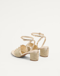 Valentino Garavani Rockstud sandal in laminated nappa leather with Cornely embroidery in raffia-effect cotton with metallic thread - Platinum-finish studs - Adjustable ankle strap - Laminated nappa leather straps and trims - Embroidered wide heel - Heel height: 60 mm/2.4 in. - Made in Italy Product code: 6W0S0MH6QIW_R16