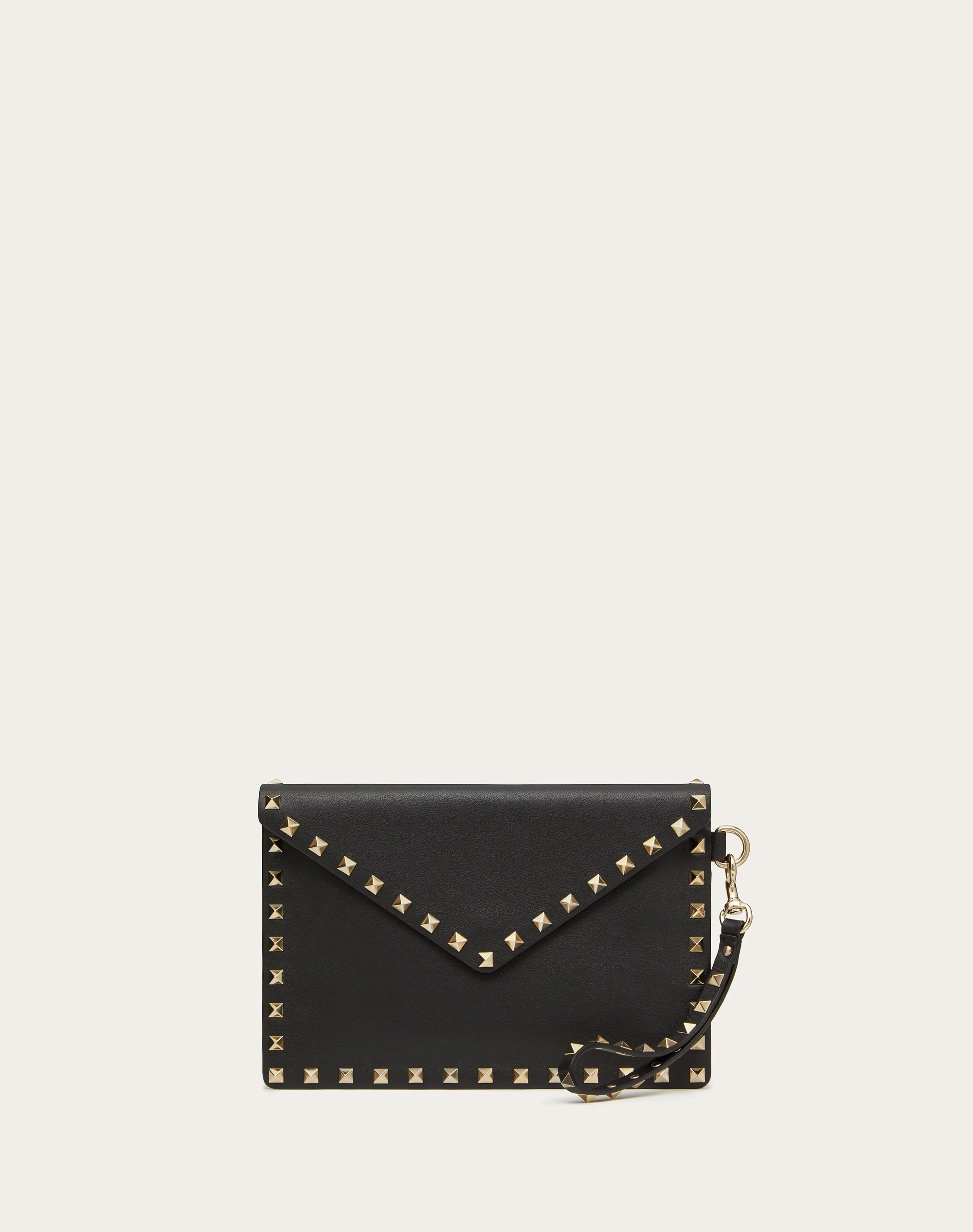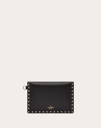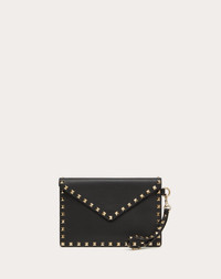 Valentino Garavani Rockstud calfskin pouch. - Platinum-finish studs - Magnetic button fastening - Four card slots - Removable wrist strap - Handle length: 15.5 cm / 5.9 in. - Dimensions: W22.5 x H15.5 cm / W8.8 x H5.9 in. - Made in Italy Product code: 5W2P0P87BOL_0NO