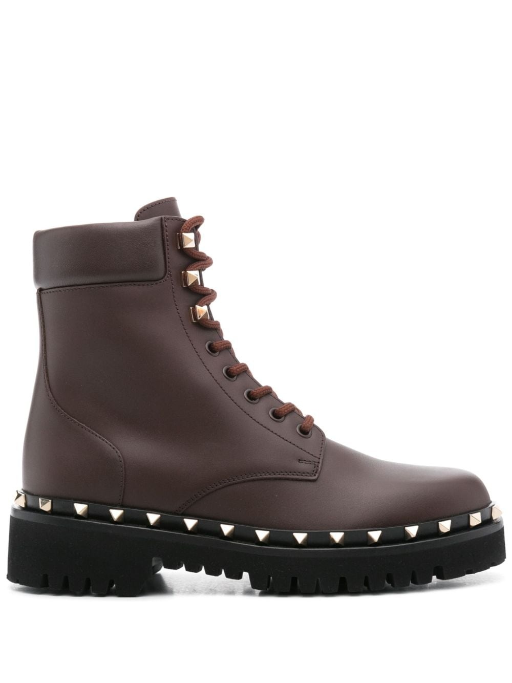 Rockstud 50mm combat boots Highlights - Chocolate brown - Calf leather - Smooth grain - Signature rockstud detailing - 50mm stacked heel - Front lace-up fastening - Ankle-length - Logo-debossed tongue - Round toe - Branded leather insole - Rubber lug sole Made In Italy Composition Outer: Calf Leather 100% Sole: Rubber 100% Lining: Calf Leather 100% SIZE & FIT Measurement HEEL 1.57 in(4 cm) HEIGHT 6.29 in(16 cm) Sole height 0.98 in(2.5 cm)