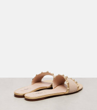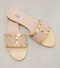 Valentino Garavani transformed classic studs into a high-fashion signature with the creation of the Rockstud. Designed for the warmer season, these slides feature a cotton upper and smooth leather trims that combine comfort with effortless style. Product Details - Upper: leather, fabric - Lining: leather - Sole: leather insole and sole - Toe shape: almond open toe - Made in Italy - Includes: dust bag, shoe box - Designer color name: Naturale/Mekong - Item color: gold, beige - Hardware color: gold - Item number: P01062338 Size & Fit - True to size - European sizes - 1,5cm-0.5" heel (size EU 38)