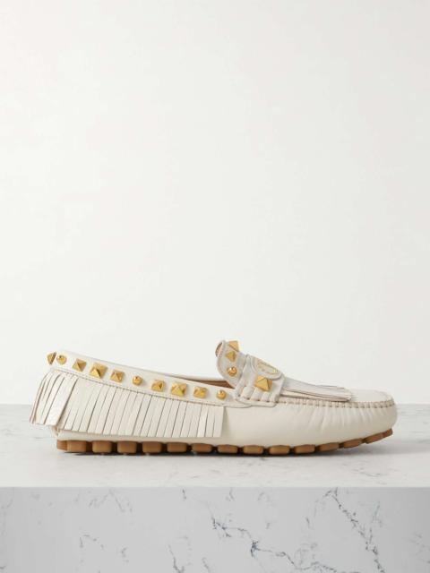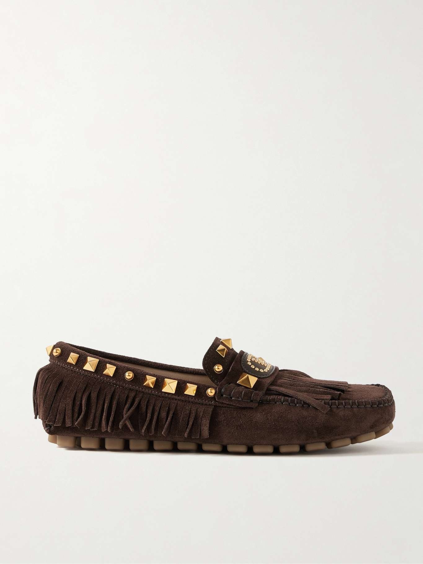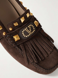 EDITORS'NOTES Valentino Garavani's loafers are decorated with two of the brand's most iconic signatures - the 'VLogo' and studs. They've been made in Italy from suede and have fringed trims and pebbled rubber soles. SIZE & FIT - Fits true to size, take your normal size - Italian sizing DETAILS & CARE - Slight heel - Chocolate suede (Calf) - Slip on - Designer color: Fondant
