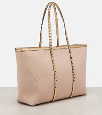 Crafted from leather and canvas, the Rockstud Large tote bag by Valentino Garavani is designed for effortless, everyday carry. This accessory features signature gold-toned stud embellishments, top handles, and a detachable inner leather pouch. Product Details - Material: leather, fabric - Lining: suede - Made in Italy - Designer color name: Naturale-Tobacco/Mekong - Item color: beige, gold - Hardware color: gold - Top handles - Closure: zipped top - Internal details: single compartment, internal zipped pouch - Protective leather bottom - Protective feet - Item number: P01056358 Size & Fit - Height 27,5cm-11" - Min. width 37,5cm-15" - Max. width 48cm-19" - Depth 13cm-5" - Length of handles 50cm-19.5" - Clutch height 15,5cm-6" - Clutch width 23cm-9"