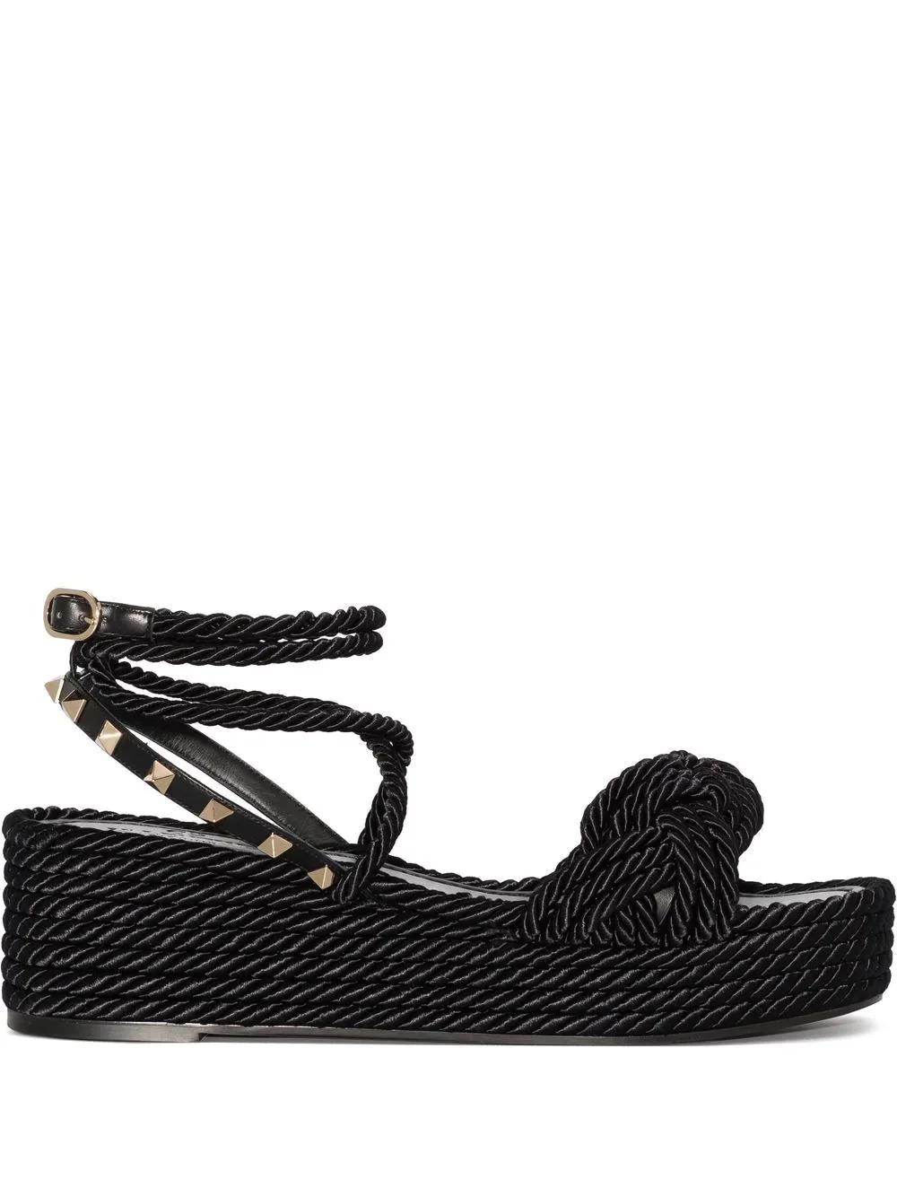 Rockstud platform sandals Created to represent the 'bugnatos' seen on palazzo-style buildings in Rome, Valentino Gavarani's Rockstud motif is an instantly recognisable house code for the Italian brand. Seen here adorning these braided sandals, a platform sole heightens the refinery. Imported Composition Sole: Plastic 100% Outer: Calf Leather 100%, Metal 100%, Cotton 60%, Acrylic 35%, Polyester 5% Lining: Calf Leather 100% SIZE & FIT Model measurements Height 5 ft 9 in(1.76 m) Bust/Chest 31.88 in(81 cm) Hips 33.07 in(84 cm) Waist 22.83 in(58 cm) FittingInformation This piece fits true to size. We recommend you get your regular size Measurement HEEL 2.51 in(6.4 cm) PLATFORM 1.57 in(4 cm) Washing instructions Read Manufacturer Guidelines