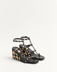 ROCKSTUD WEDGE SANDAL IN CALFSKIN WITH CHECK EMBROIDERY 80MM