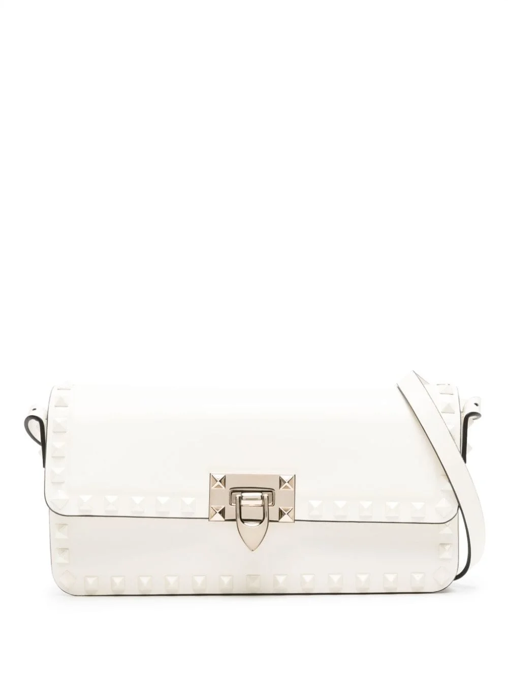 Rockstud23 East-West shoulder bag Crafted from smooth calf leather to an elongated East-West silhouette, this white Rockstud23 shoulder bag by Valentino Garavani makes a statement thanks to tonal enamelled Rockstud trim and silver-tone hardware, lending a sharp edge. Highlights - Black tie collection - White - Calf leather - Smooth grain - Signature rockstud detailing - Silver-tone hardware - Logo stamp to the rear - Foldover top - Hook fastening - Adjustable shoulder strap - Main compartment - Internal slip pocket - Internal logo stamp Made in Italy Composition Outer: Calf Leather 100% SIZE & FIT Model measurements Height 5 ft 10 in(1.79 m) Bust/Chest 32.67 in(83 cm) Hips 34.25 in(87 cm) Waist 24.4 in(62 cm) Measurement DEPTH 1.96 in(5 cm) HEIGHT 3.93 in(10 cm) STRAP 22.44 in(57 cm) WIDTH 9.05 in(23 cm)