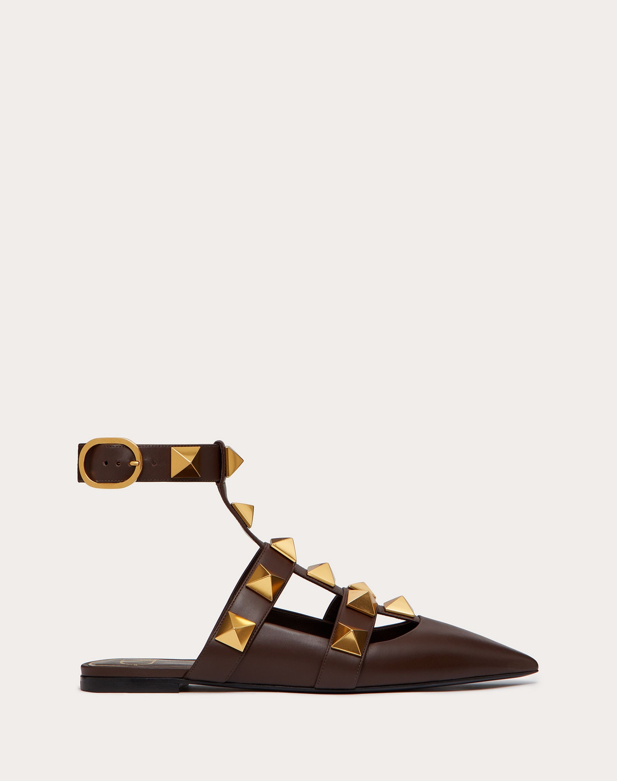 Valentino Garavani Roman Stud ballet in calfskin with straps embellished with maxi studs. - 18x18 mm / .7x.7 in. maxi studs with an antique-brass finish - Ankle strap with adjustable maxi buckle fastening - Heel height 5 mm/0.25" - Made in Italy Product Code: XW2S0BY5ZWMKG8_