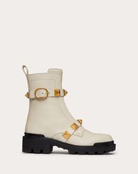Valentino Garavani Roman Stud combat boot in calfskin with straps embellished with maxi studs. - Maxi studs 18x18 mm / 0.7x0.7 in. with an antique-brass finish - Rubber sole with personalized with maxi stud relief design - Side zipper fastening and strap with maxi buckle - Heel height: 40 mm/1.6 in. - Made in Italy Product Code WS0CJ3NKD_I16