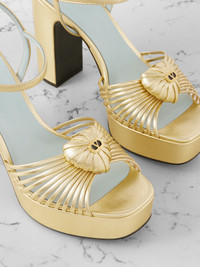 Taking cues from '70s styles, Valentino Garavani's sandals are made from gold leather and stacked on chunky platforms with high 115mm block heels. They have a series of slim straps, centered by decorative 'VLogo' hearts.