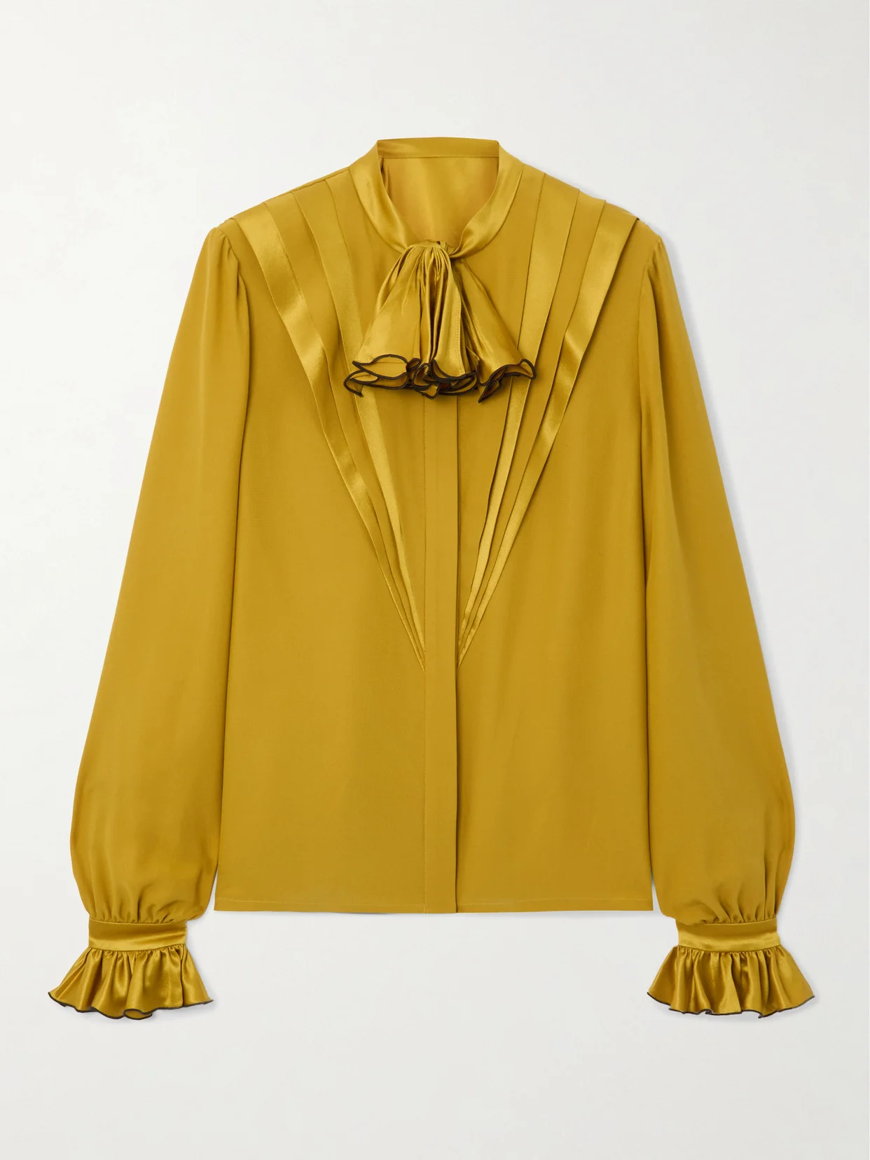 Valentino Garavani's graceful blouse feels unapologetically retro. Worn at the Fall '25 show, where its jabot glimpsed from under the collar of a sweater, it's cut from silk with gathered cuffs and Art Deco-esque pleats running down the bodice.