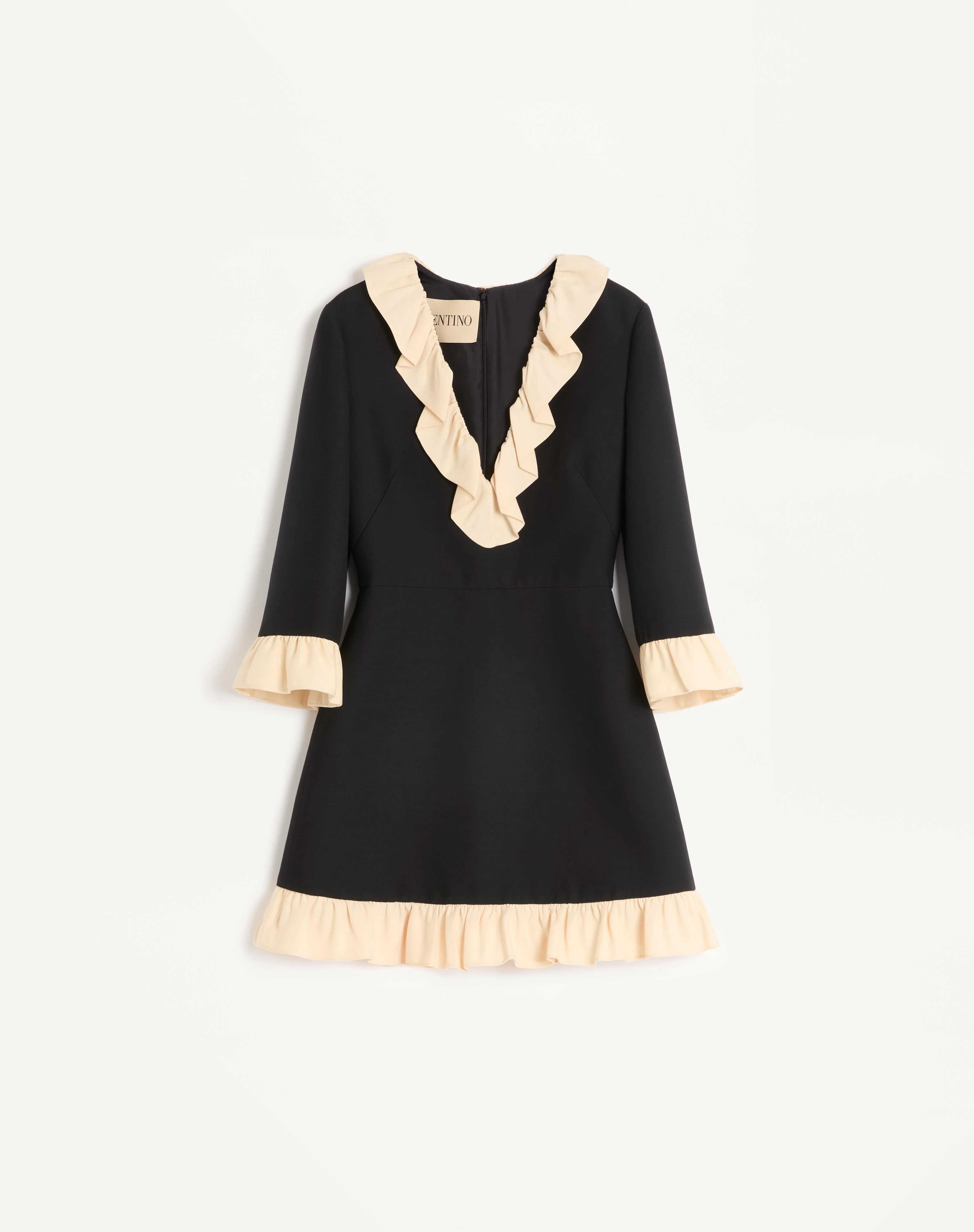 Crepe Couture short dress with ruffles - Rear zipper closure - Crepe Couture (65% Virgin Wool, 35% Silk) - Habotai lining (100% Silk) - Length: 90 cm / 35.4 in. from the shoulders in an Italian size 40 - The model is 176 cm / 5'9" tall and wears an Italian size 40 - Made in Italy The look of the model is completed by a Valentino Garavani Vain Bag and Valentino Garavani Hi Dolly Shoes. Product code: 7B3VADY01CF_TB1