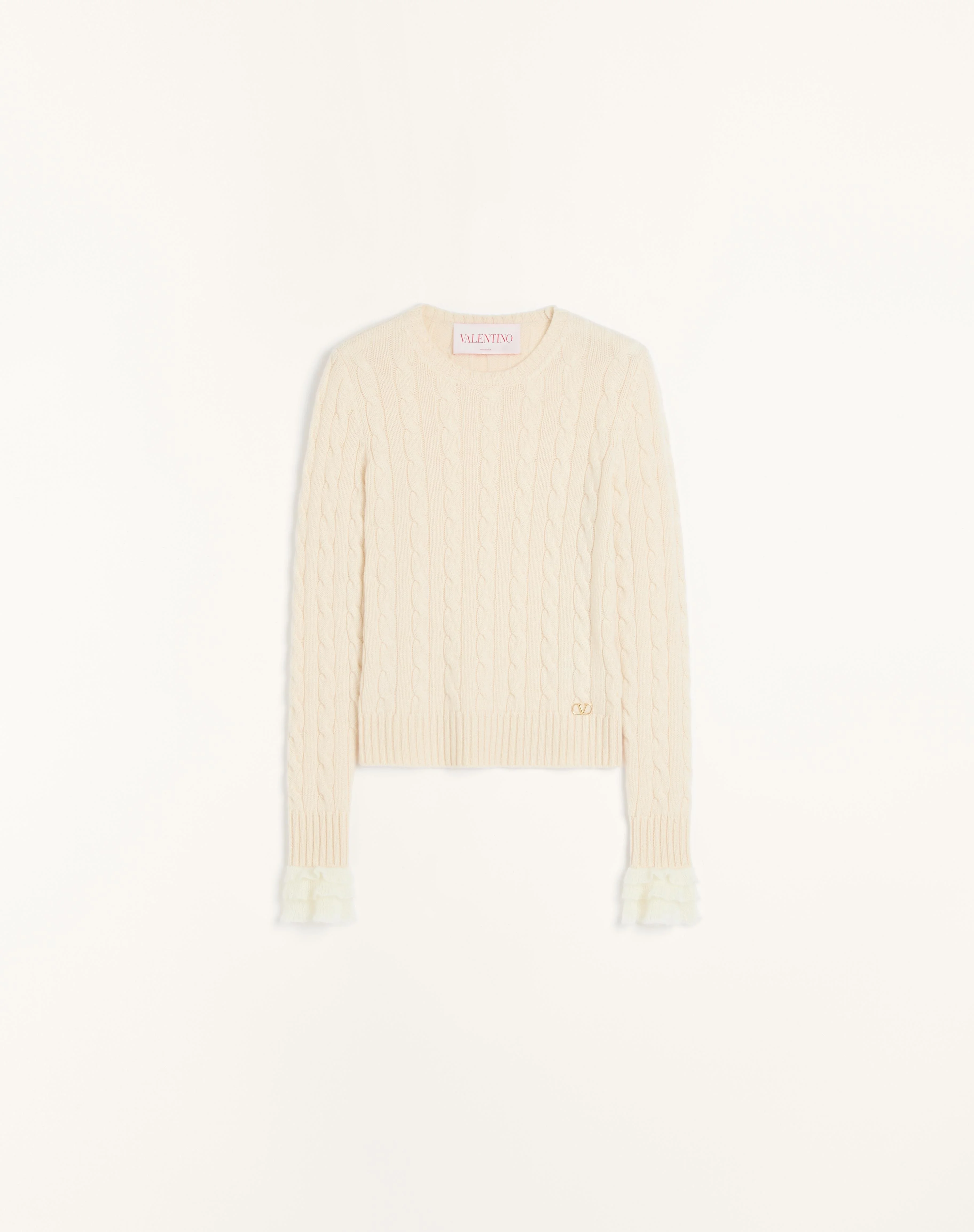 Cashmere sweater - Mohair ruffle detail on cuffs - Cashmere (100% Cashmere) - Length: 55 cm / 21.6 in. from the shoulders in a size S - Sleeve length: 78 cm / 30.7 in. from the center back in an Italian size S - The model is 176 cm / 5'9" tall and wears an Italian size S - Made in Italy The look of the model is completed by a Valentino Garavani Nellcote Bag and Valentino Garavani Ladycrush Shoes. Product code: 6B3KC62D923_R0N