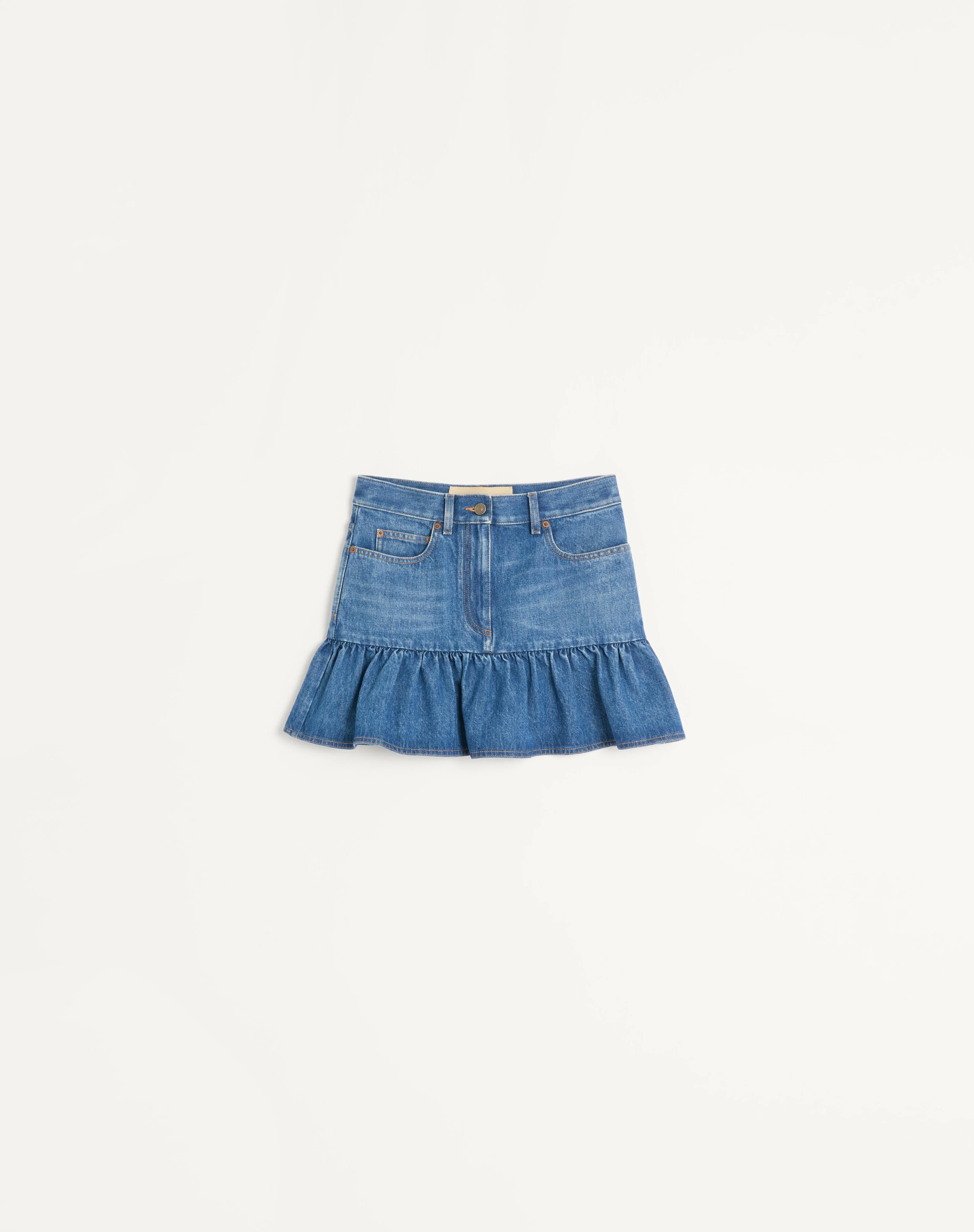 Denim mini skirt with ruffle hem - VLogo button detail - Front button and zipper closure - Medium Blue Denim (100% Cotton) - Length: 37 cm / 14.6 in. from the waist in an Italian size 40 - The model is 176 cm / 5'9" tall and wears an Italian size 40 - Made in Italy The look of the model is completed by a Valentino Garavani Le Chat de La Maison Bag and Valentino Garavani Adamantine Shoes. Product code: 7B3DD20L9KH_558
