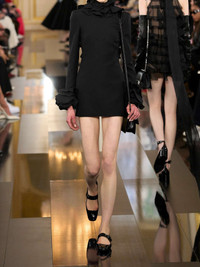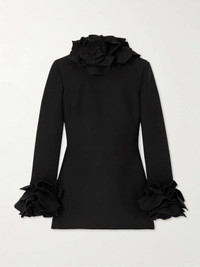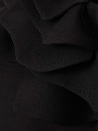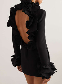 EDITORS'NOTES Valentino Garavani's all-black Fall '24 collection reimagines signature house codes from the '80s. Tailored from virgin wool and silk-blend crepe, this mini dress has a ruffled neckline and cuffs, padded shoulders and an open-back tipped with a bow. Wear yours with Mary Jane pumps to emulate the runway styling. SIZE & FIT Model measurements: - Fits true to size, take your normal size - Those with a curvy figure may wish to take the next size up - Designed for a close fit - Particularly short in length - Mid-weight, non-stretchy fabric - Model is 177cm/ 5'10" and is wearing an IT 40 - Bust: 85cm/ 33.5” - Waist: 65cm/ 25.5” - Hip: 91cm/ 36” DETAILS & CARE - Black virgin wool and silk-blend crepe - Concealed hook and zip fastening at back - 65% virgin wool, 35% silk