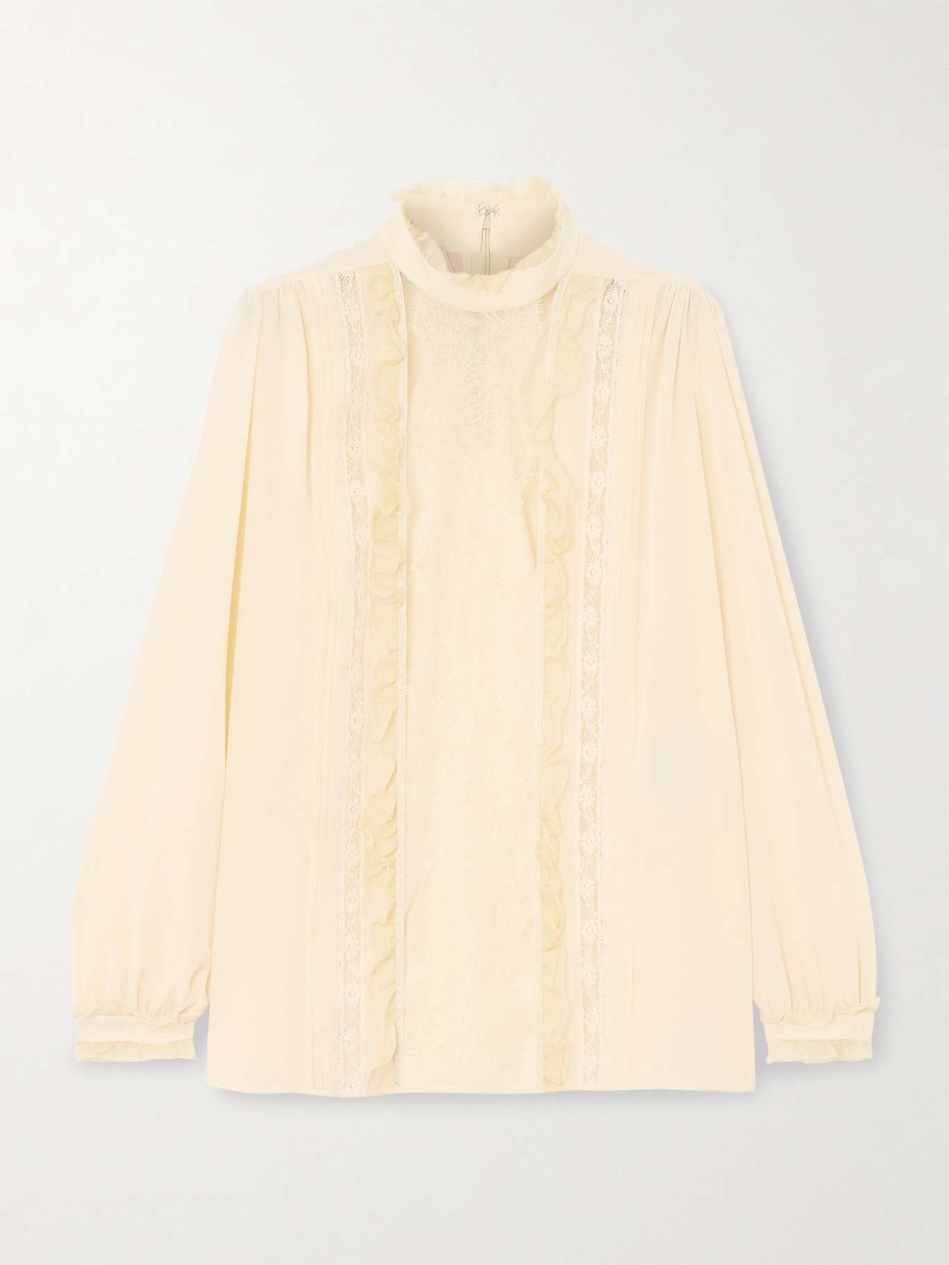 EDITORS'NOTES Alessandro Michele’s debut collection at the creative helm of Valentino Garavani proves maximalism still holds a prominent place in the industry. This blouse is made from pastel-yellow silk crepe de chine and has a sheer lace panel along the center that creates bold drama - it's framed by ruffles and pintucks that add textural dimension and contrast. SIZE & FIT - Fits true to size, take your normal size - Designed for a loose fit - Lightweight, non-stretchy fabric with semi-sheer fabric panels - Model is 177cm/ 5'10" and is wearing an IT 40 DETAILS & CARE - Pastel-yellow silk crepe de chine and lace - Concealed hook and zip fastening at back - 100% silk; trim: 95% cotton, 5% polyamide - Dry clean