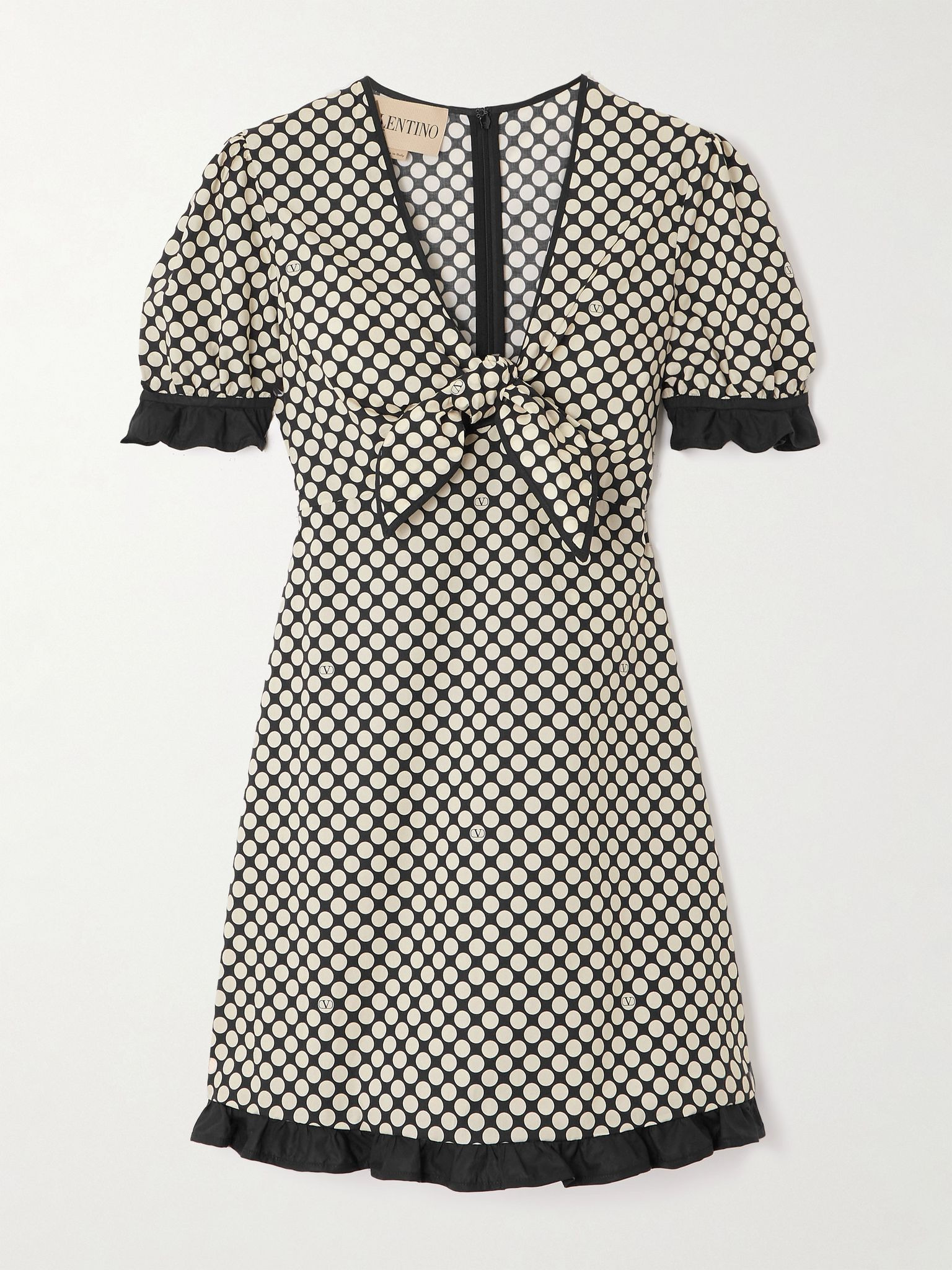 Valentino Garavani draws inspiration from vintage tea dresses with this retro mini. Made from cotton-poplin, it has puffed sleeves, a voluminous bow and black ruffleds that add to the feminine feel. Look closely and you'll see the 'VLogo' incorporated in the polka-dot pattern. Size & Fit - Fits true to size, however those who are between sizes should take the smaller size - Designed for a slim fit - Lightweight, non-stretchy fabric - Model is 180cm/ 5'11" and is wearing an IT 38 Model measurements: - Bust: 86cm/ 34" - Waist: 65cm/ 25.5" - Hip: 90cm/ 35.5" Details & Care - Black and cream cotton-poplin - Concealed hook and zip fastening at back - 100% cotton - Dry clean