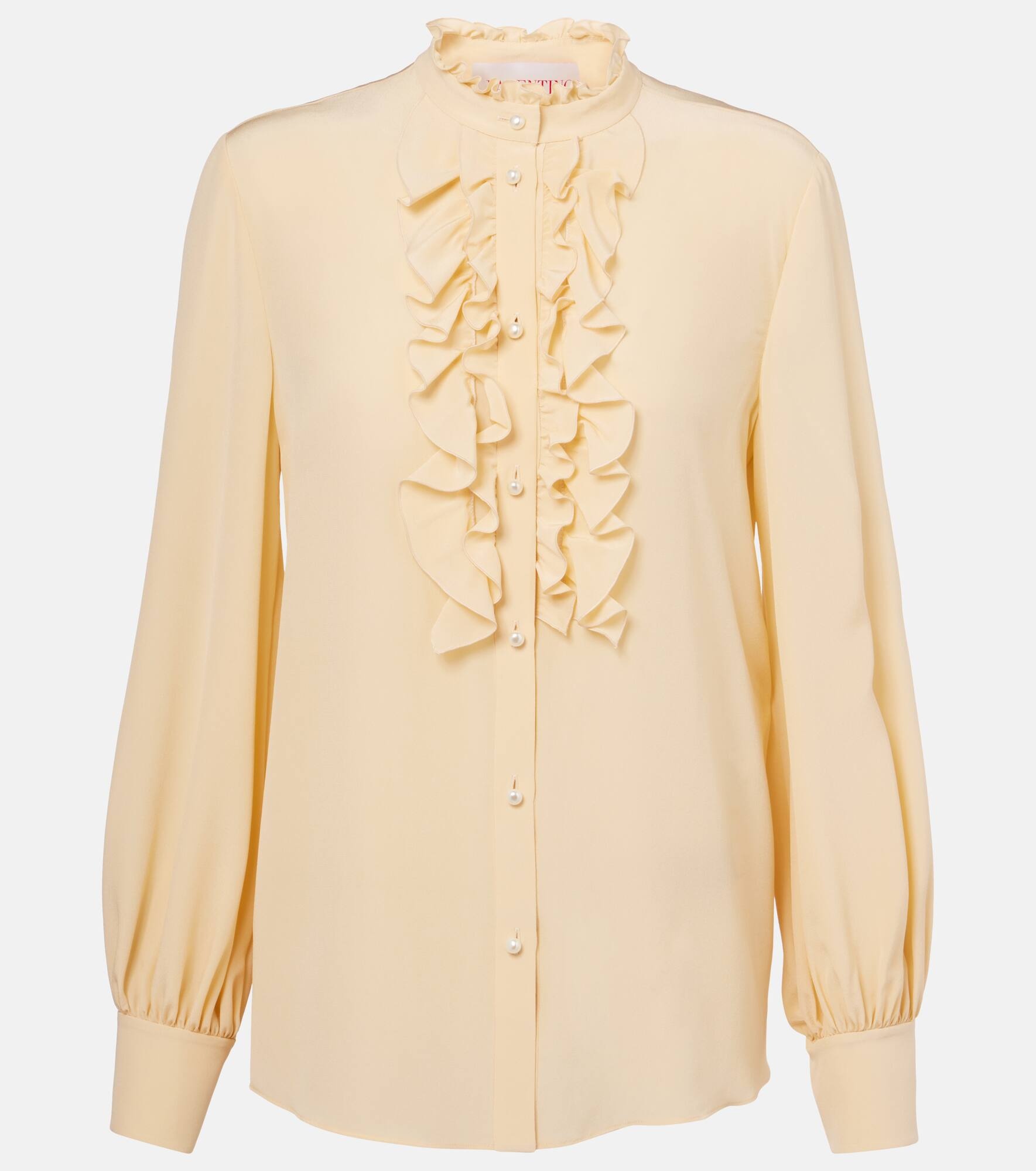 Cascading ruffles and a high neckline define the graceful silhouette of this Valentino silk blouse. Faux pearl buttons and gathered sleeves elevate the look with subtle elegance. Product Details - Material: 100% silk - Care instructions: dry clean - Made in Italy - Designer color name: Betulla - Item color: ivory - Closure: buttoned front - Item number: P01026728 Size & Fit - True to size - Semi-sheer - Straight fit - Non-stretchy fabric - Falls to the hip - The model seen in the picture is 178cm-5'10" and wearing a size IT 40