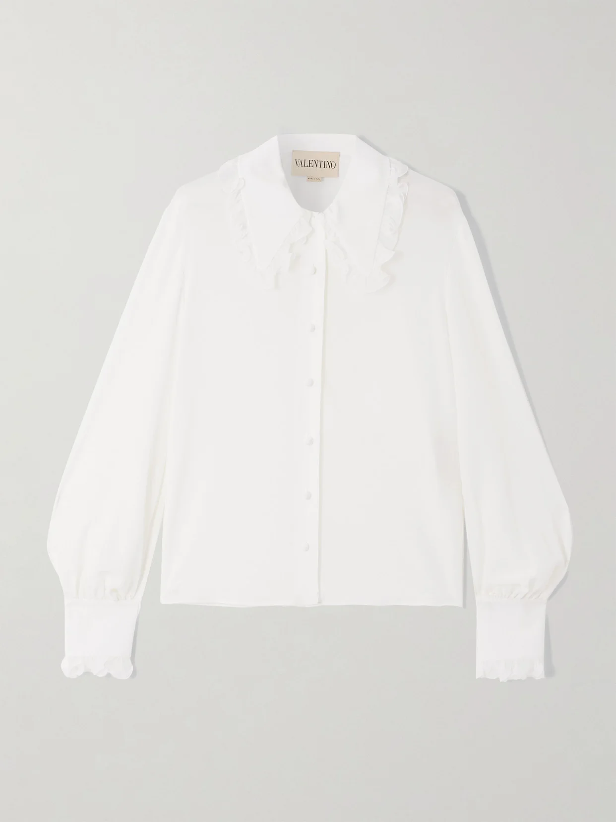 The fluttery collar of Valentino Garavani's shirt makes any outfit look lovelier. It's been tailored in Italy from ultra light silk-crepe, which falls airily through the blouson sleeves.