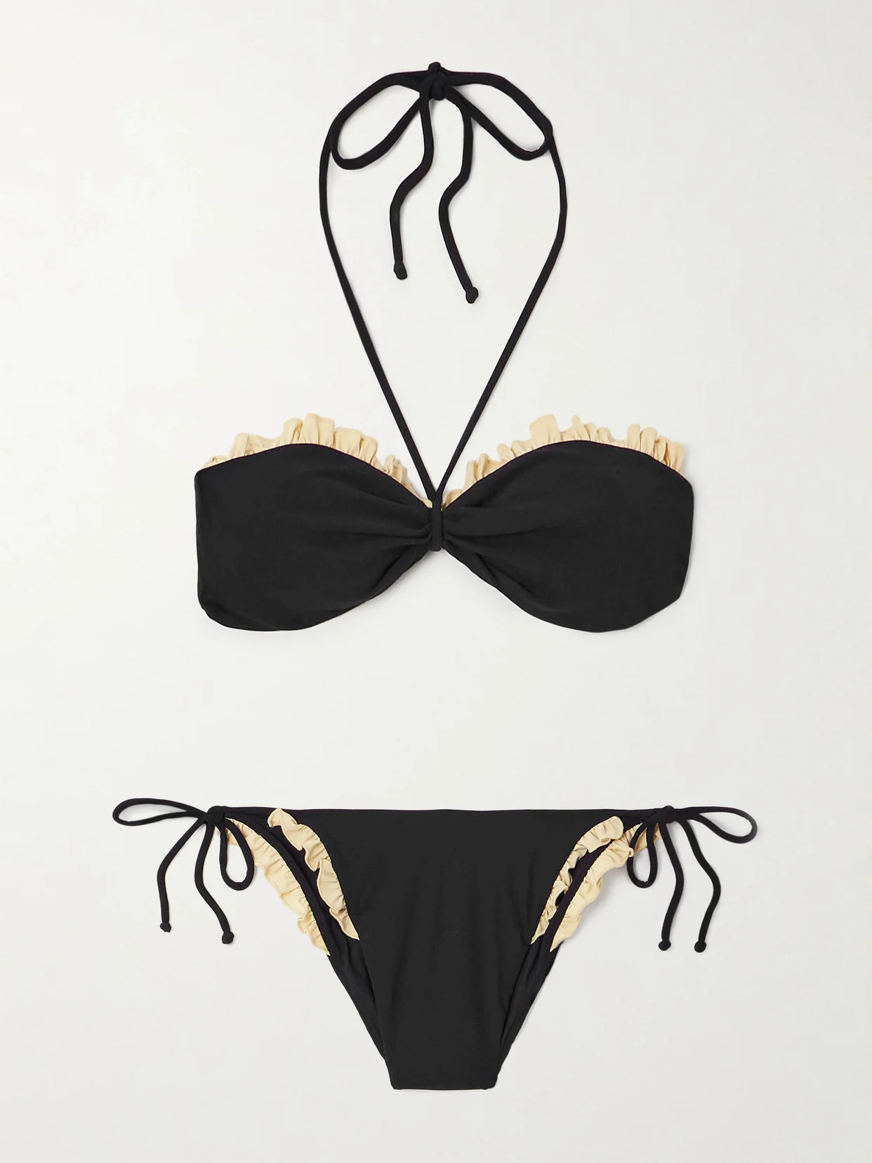 Valentino Garavani's bikini is traced with cream ruffles, giving it such a sweet feel. It's been made in Italy from supportive stretch fabric and has a bandeau top with halter ties and low-rise briefs.