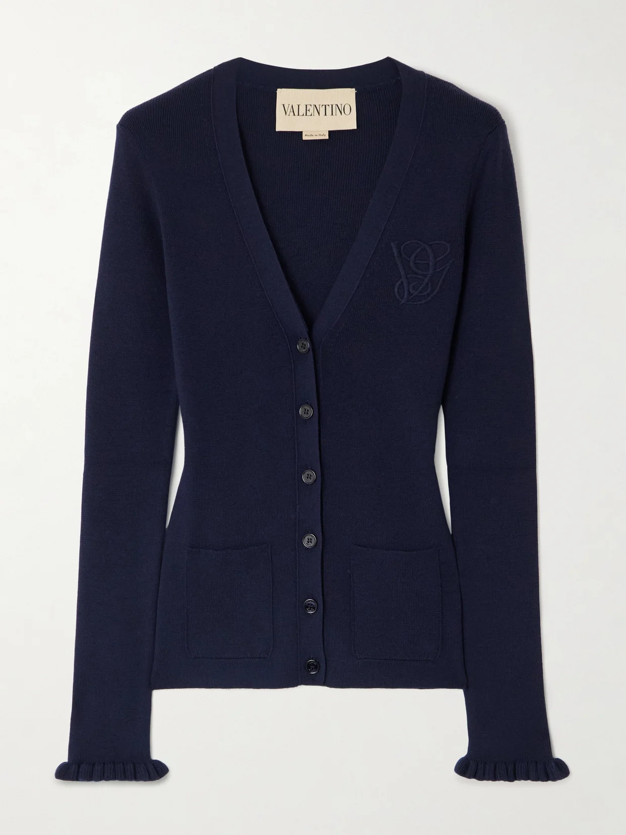 With understated yet distinctive touches, Valentino Garavani transforms this classic cardigan into something special. Detailed with ruffles along the cuffs, it's made from wool for a slim fit and embroidered with a heritage-inspired logo on the chest.