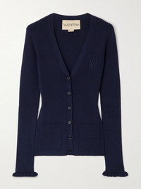 With understated yet distinctive touches, Valentino Garavani transforms this classic cardigan into something special. Detailed with ruffles along the cuffs, it's made from wool for a slim fit and embroidered with a heritage-inspired logo on the chest. Size & Fit - Fits true to size, take your normal size - Designed for a slim fit - Lightweight knit - Model is 177cm/ 5'10" and is wearing a size XSmall Model measurements: - Bust: 81cm/ 32" - Waist: 62cm/ 24.5" - Hip: 89cm/ 35" Details & Care - Navy wool - Button fastenings through front - 100% virgin wool - Hand wash