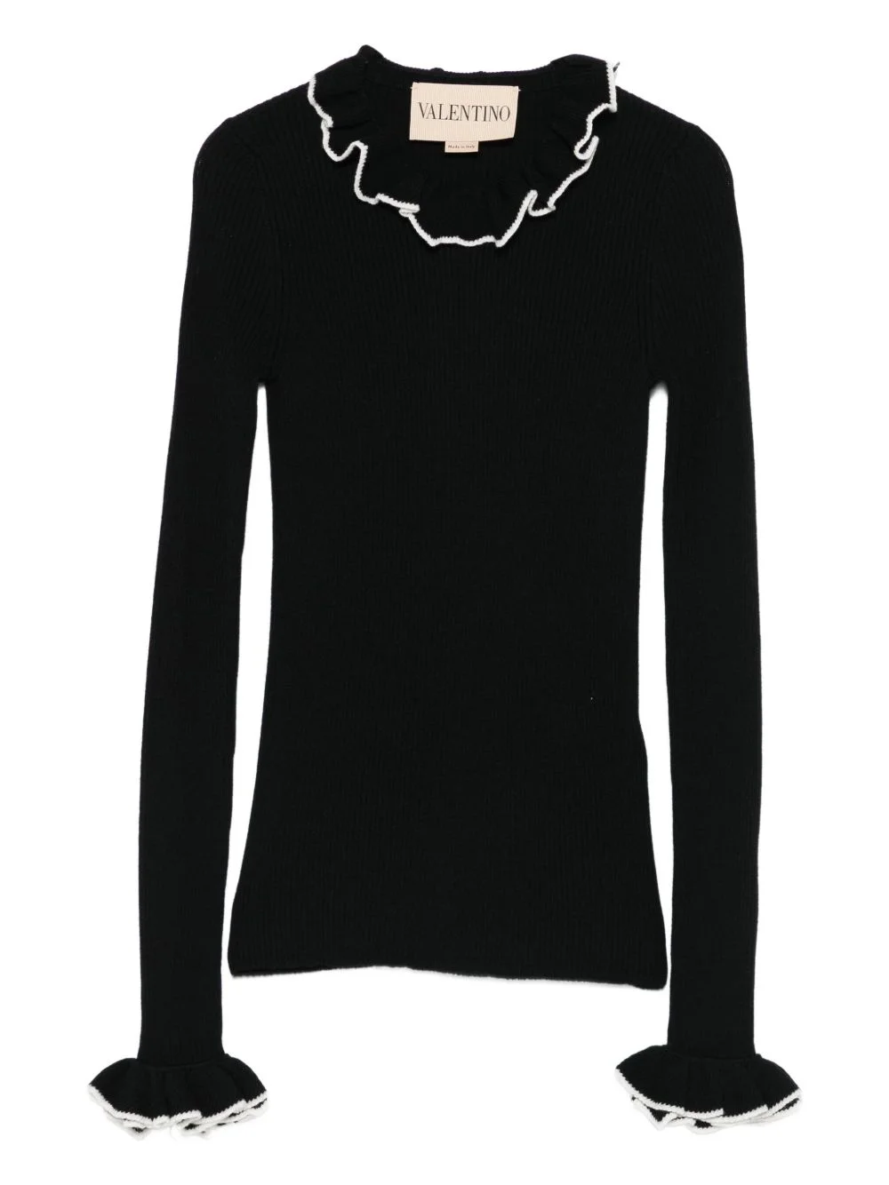 virgin wool knitted top Highlights - Black - Ribbed knit - Virgin wool - Long sleeves - Ruffled detailing Made in Italy Composition Virgin Wool 100% SIZE & FIT Model measurements Height 5 ft 9 in(1.75 m) Bust/Chest 34.64 in(88 cm) Hips 36.61 in(93 cm) Waist 26.37 in(67 cm) Washing instructions Read Manufacturer Guidelines