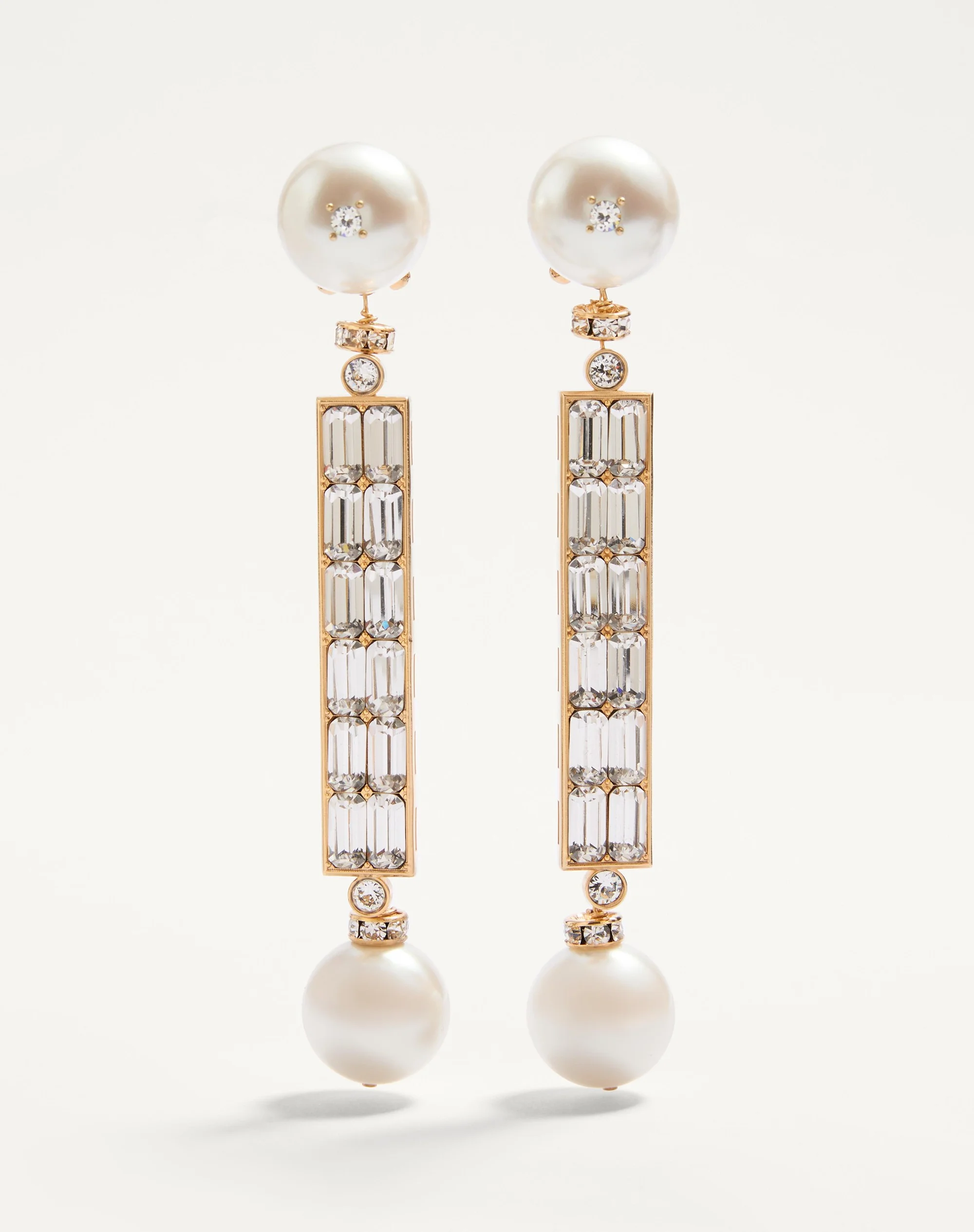 Sans Fin Earrings in Metal, Pearls and Swarovski® Crystals - Gold-tone finish - Resin pearls - Round and baguette-cut Swarovski® crystals - Openwork back - Pearl detail with Swarovski® crystals and Parisian points - Pearl size: 20 mm / 0.8 in. - Dimensions: 2 x 13 cm / 0.8 x 5.1 in. - Clip and pin closure for pierced ears - Made in Italy Product code: 7W2J0AP0HJY_CNP