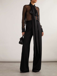 EDITORS'NOTES Valentino Garavani's blouse is cut from sheer silk-chiffon and ties in a dramatic bow around the neck. It's tailored with buttoned cuffs and a strong collar that add just enough definition to structure the whisper-weight fabric. Layer yours over a lace bra. SIZE & FIT Model measurements: - Fits true to size, take your normal size - Designed for a draped silhouette, cut to be worn very loose - Lightweight, non-stretchy fabric - Model is 177cm/ 5'10" and is wearing an IT 40 - Bust: 85cm/ 33.5” - Waist: 65cm/ 25.5” - Hip: 91cm/ 36” DETAILS & CARE - Black silk-chiffon - Concealed button fastenings through front - 100% silk