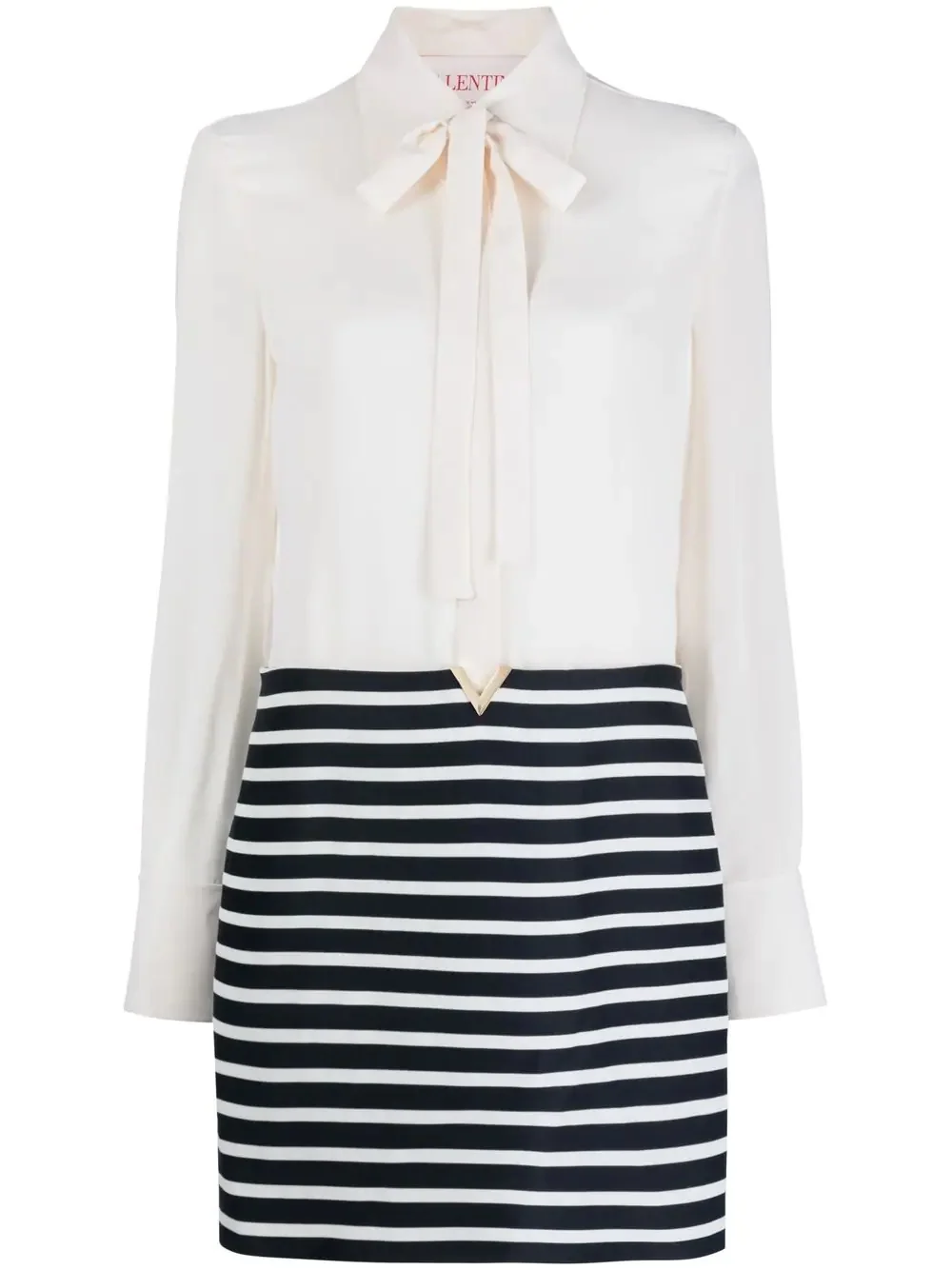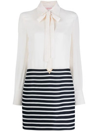 shirt mini dress Valentino Garavani's romantic spirit is channelled through this mini dress defined by its delicate pussy-bow collar and flowy silk-virgin wool blend fabric. A gold-tone V plaque decorates the waist and adds a signature refined finish. Highlights - Valentino ready to wear - Coral pink - Virgin wool blend - Classic collar - Pussy-bow collar - Horizontal stripe pattern - Buttoned-cuff sleeves Made in Italy Composition Outer: Silk 100%, Virgin Wool 65%, Viscose 35% Lining: Viscose 91%, Spandex/Elastane 9% SIZE & FIT Model measurements Height 5 ft 10 in(1.77 m) Bust/Chest 31.49 in(80 cm) Hips 33.85 in(86 cm) Waist 22.44 in(57 cm) Washing instructions Dry Clean Only